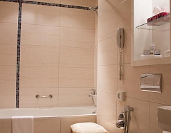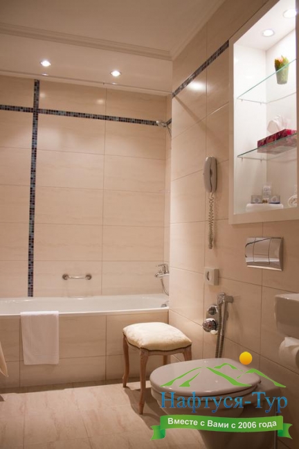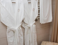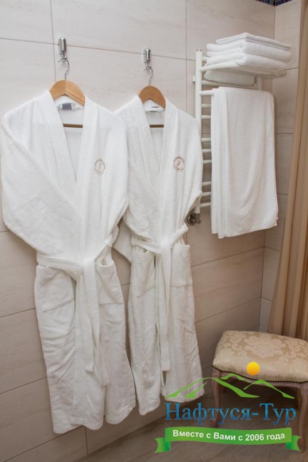 с ванной или душевой кабиной, тапочки, туалетные принадлежности, фен, халат
