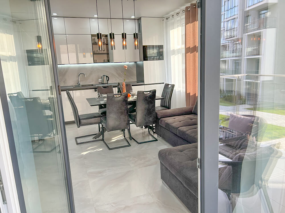 Самолетом до аэропорта г. Калининград, далее на маршрутном такси №244э до остановки «Центральный рынок», далее пройти 75 м до остановки «Автовокзал» и на автобусе №125, 118 двигаться до остановки «Тихое Озеро», далее 1,75 км до апартаментов.