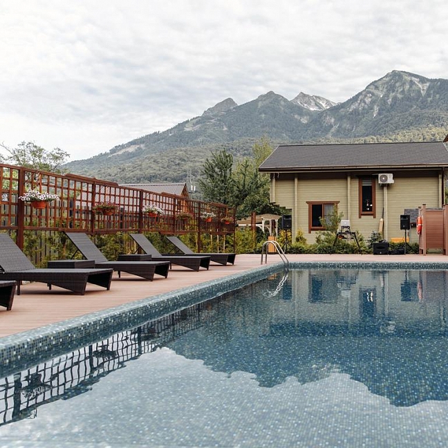 - открытый бассейн, банный комплекс с видом на Кавказские горы