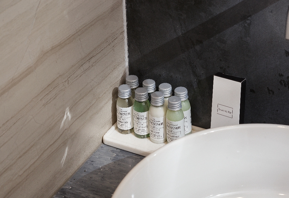 с душем, тапочки, туалетные принадлежности, фен, халат