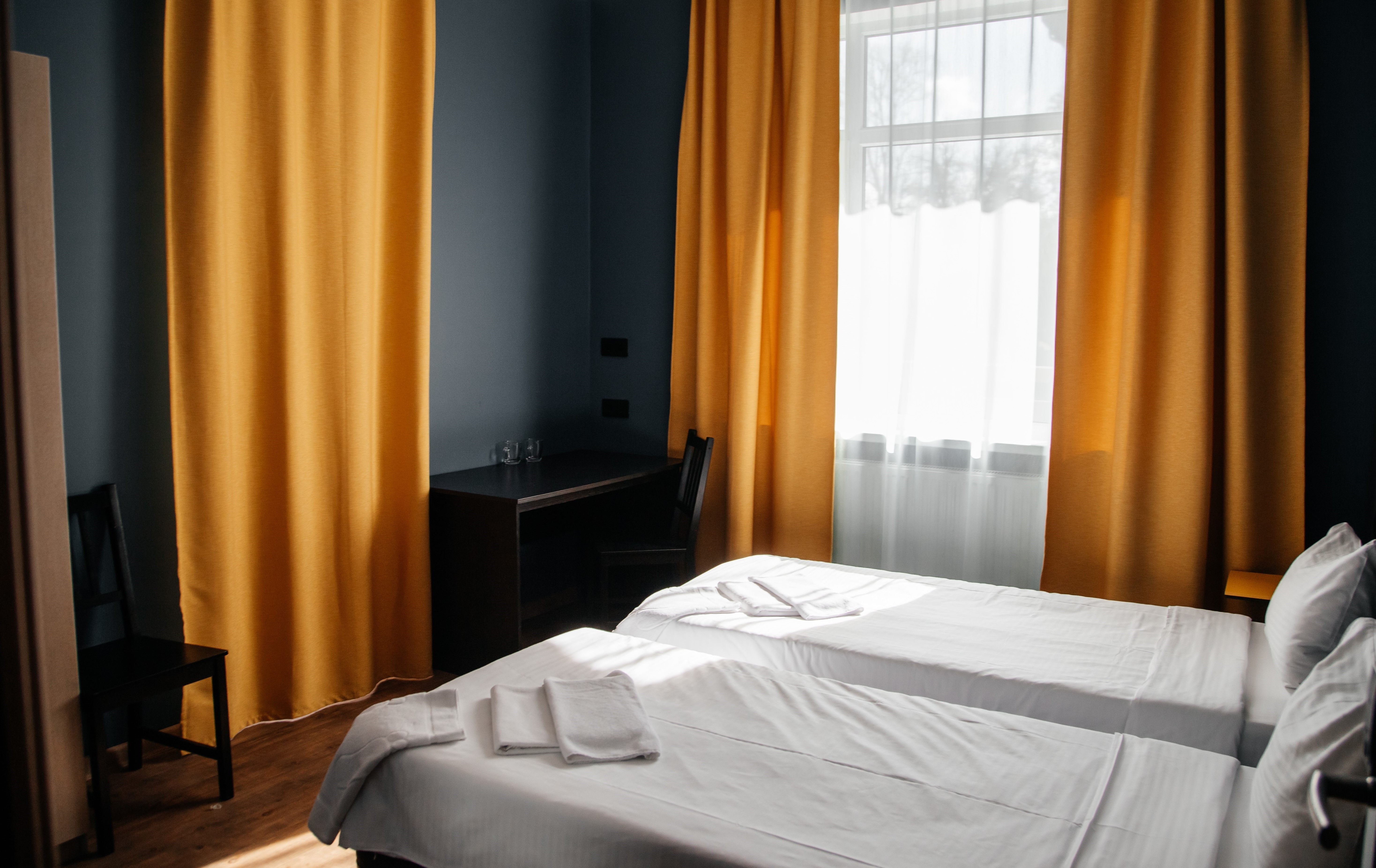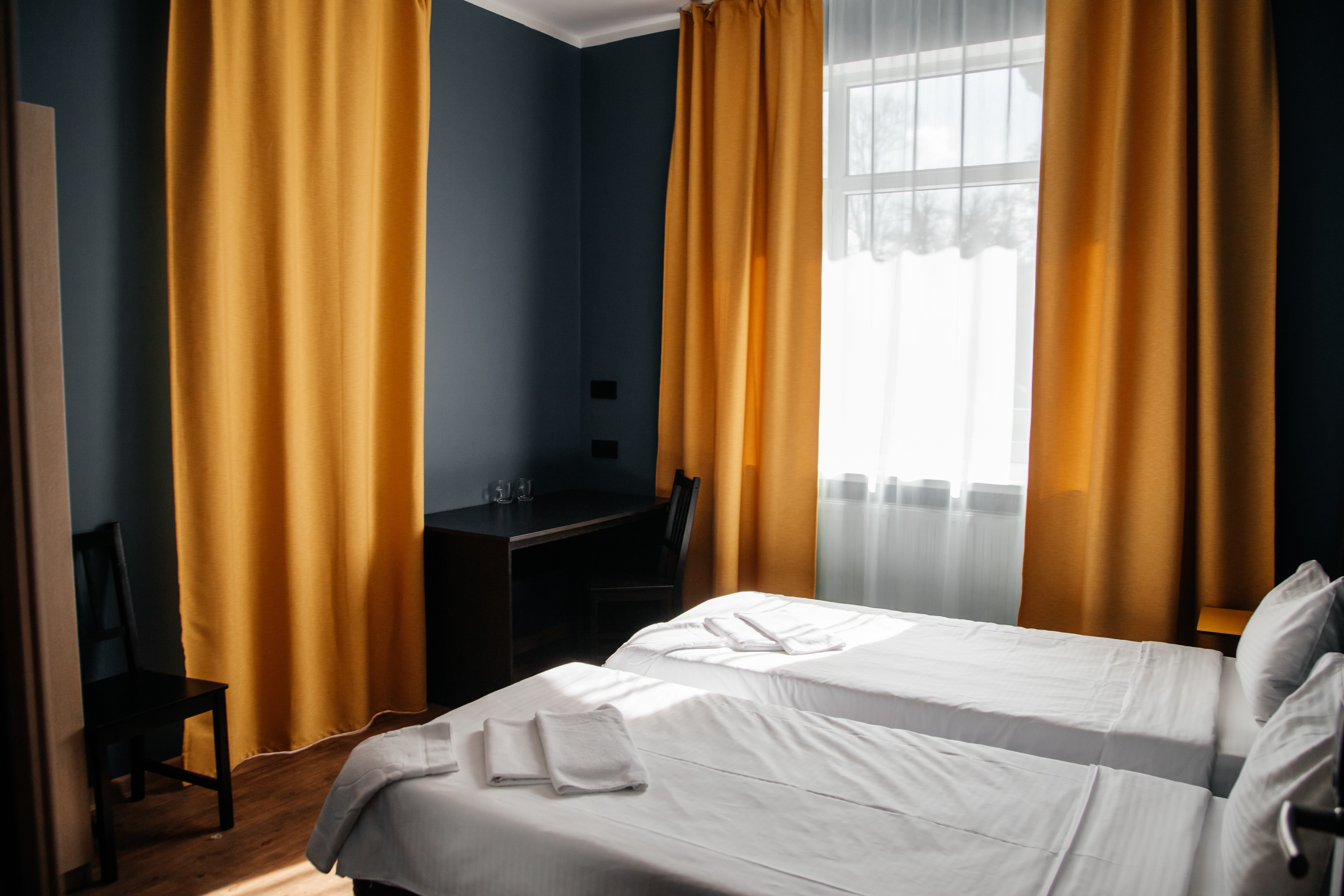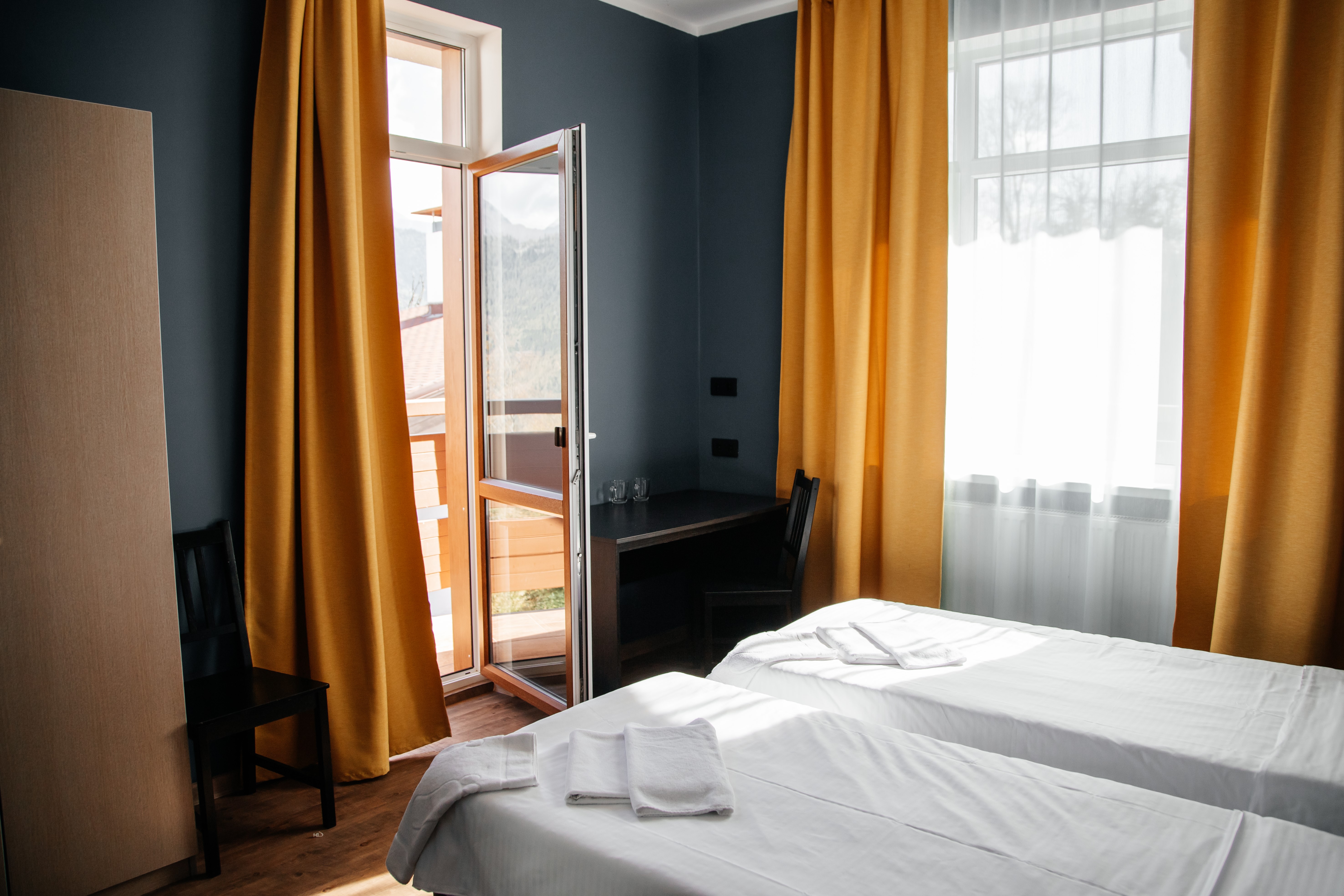 кровати односпальные, прикроватные тумбочки, стол, стул, шкаф