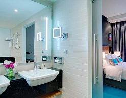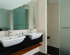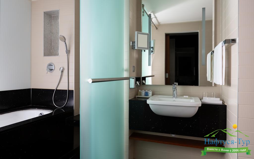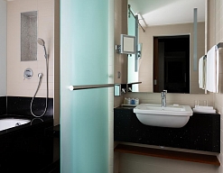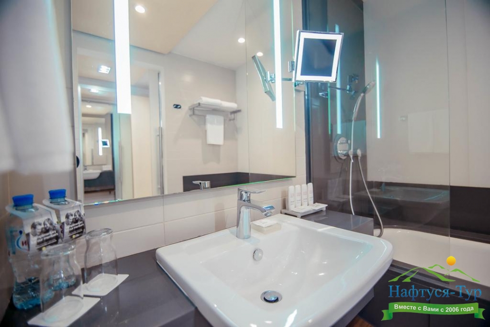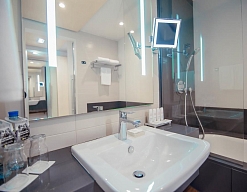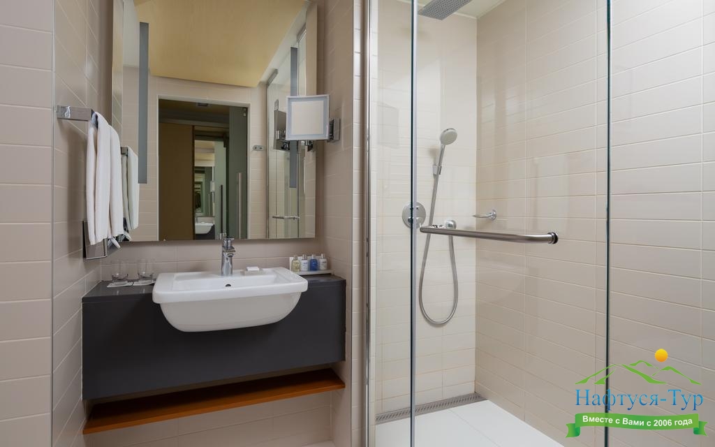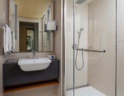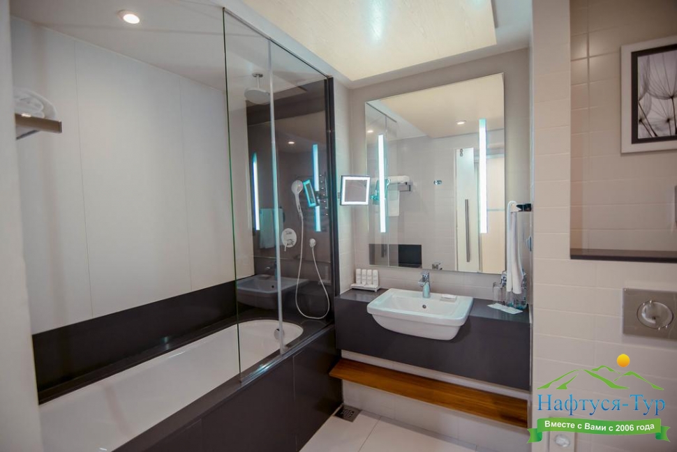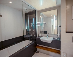 с ванной, с душевой кабиной, тапочки, туалетные принадлежности, фен, халат