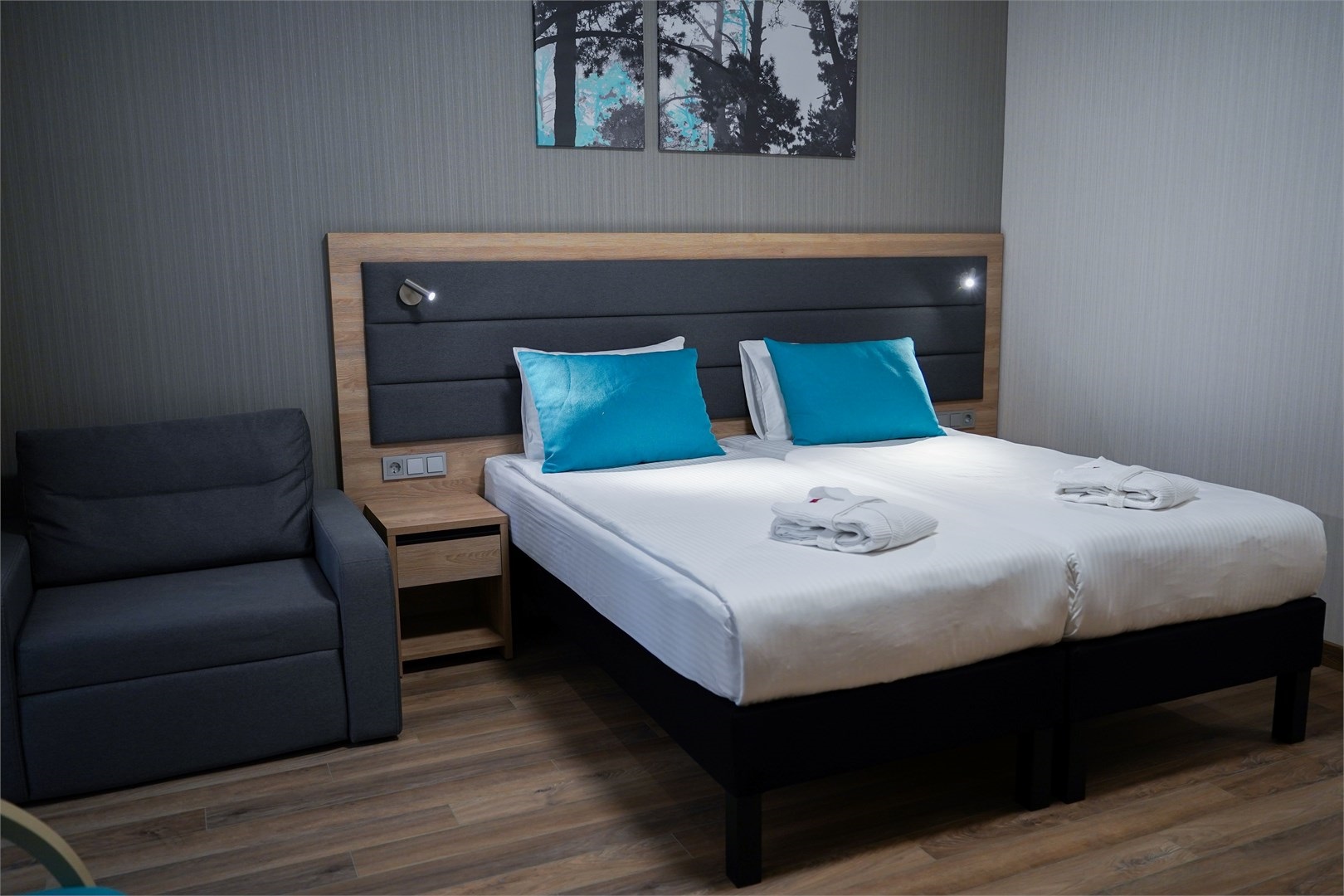 кровати односпальные, прикроватные тумбочки, столик журнальный, стулья