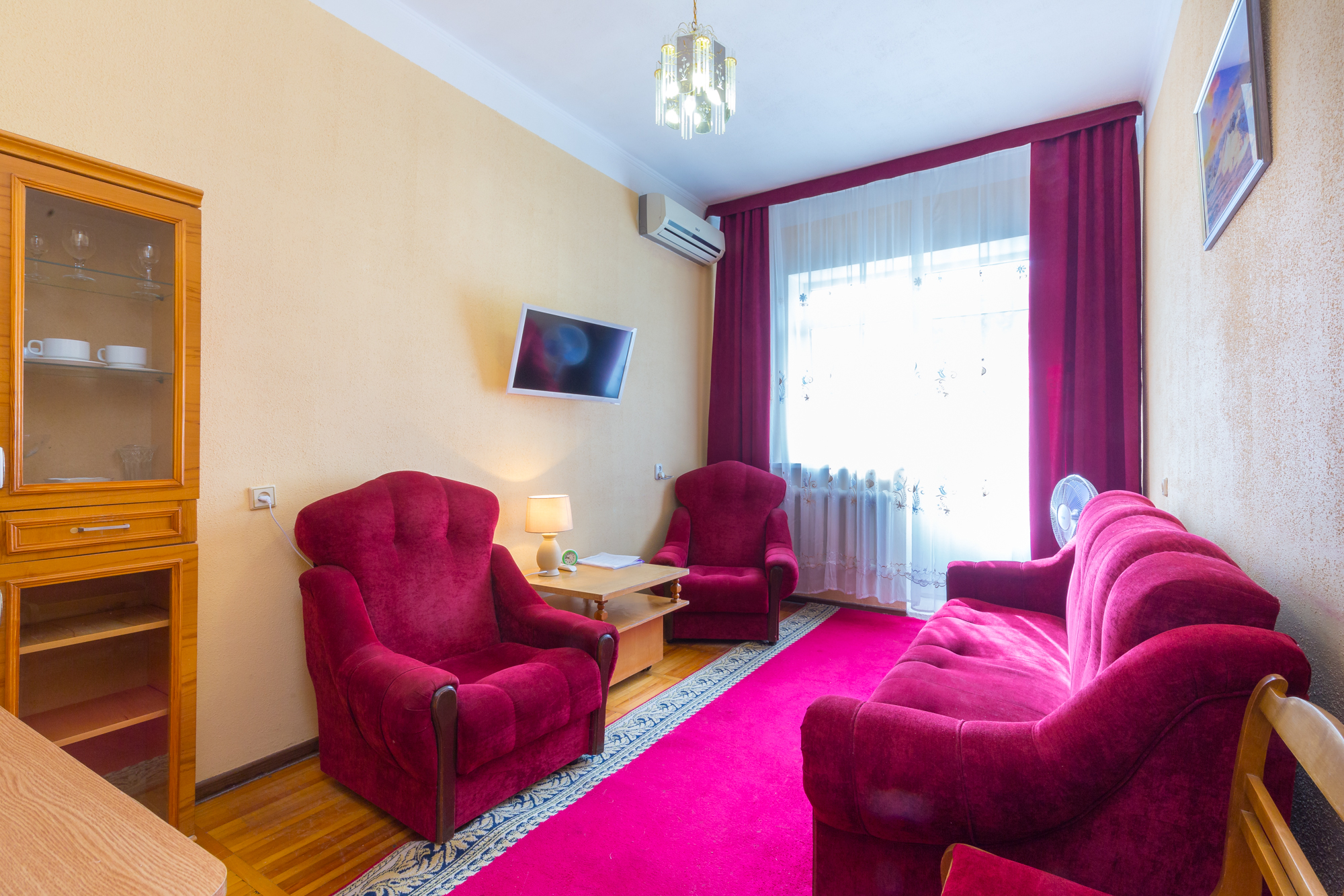гладильная доска, сплит-система, телевизор, утюг, холодильник, чайный набор посуды, электрочайник