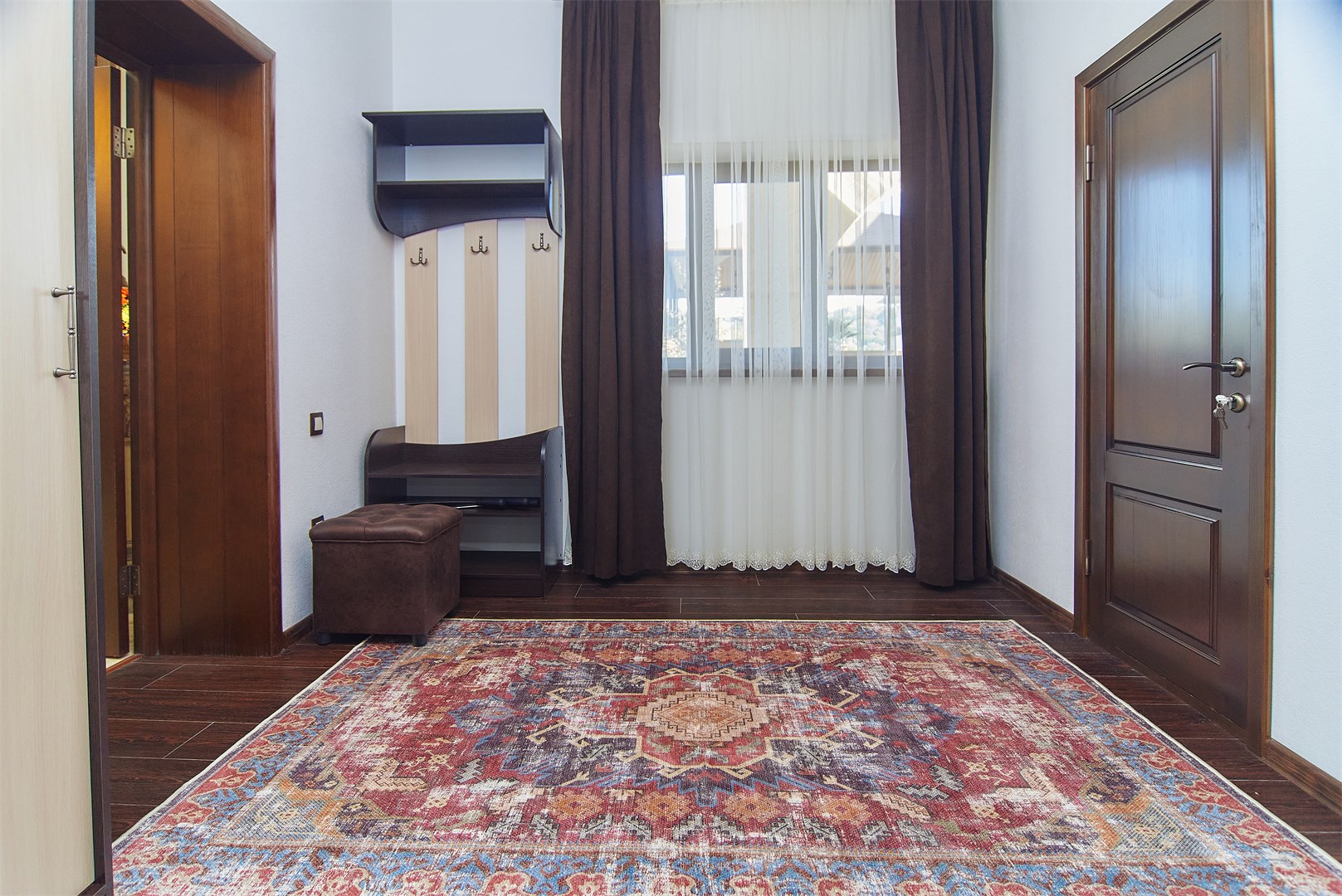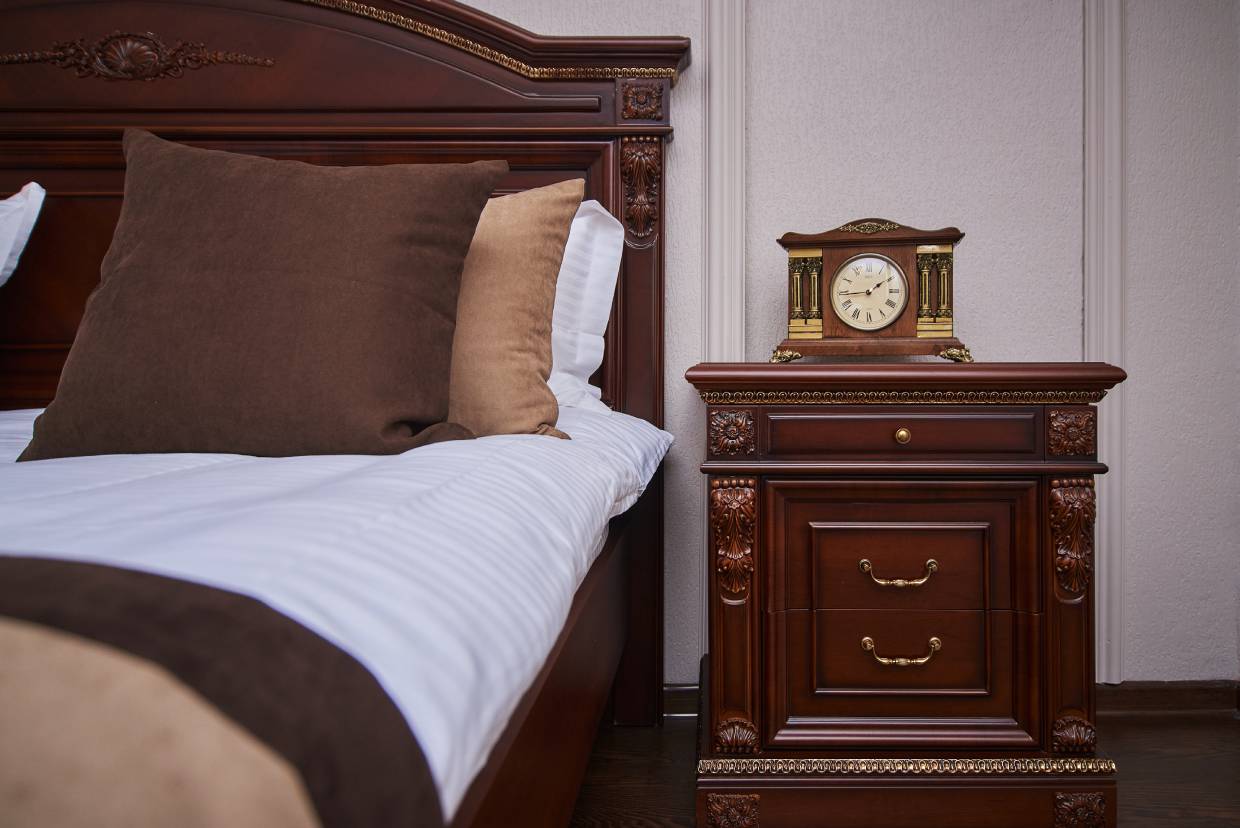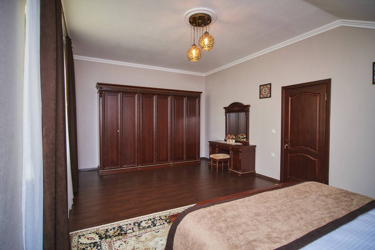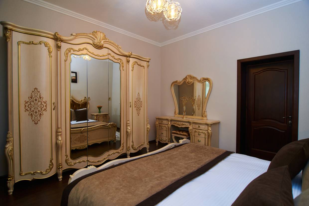 вешалка, диван, зеркало, кресла, кровать двуспальная, прикроватные тумбочки, стол, стол обеденный, стулья, шкаф