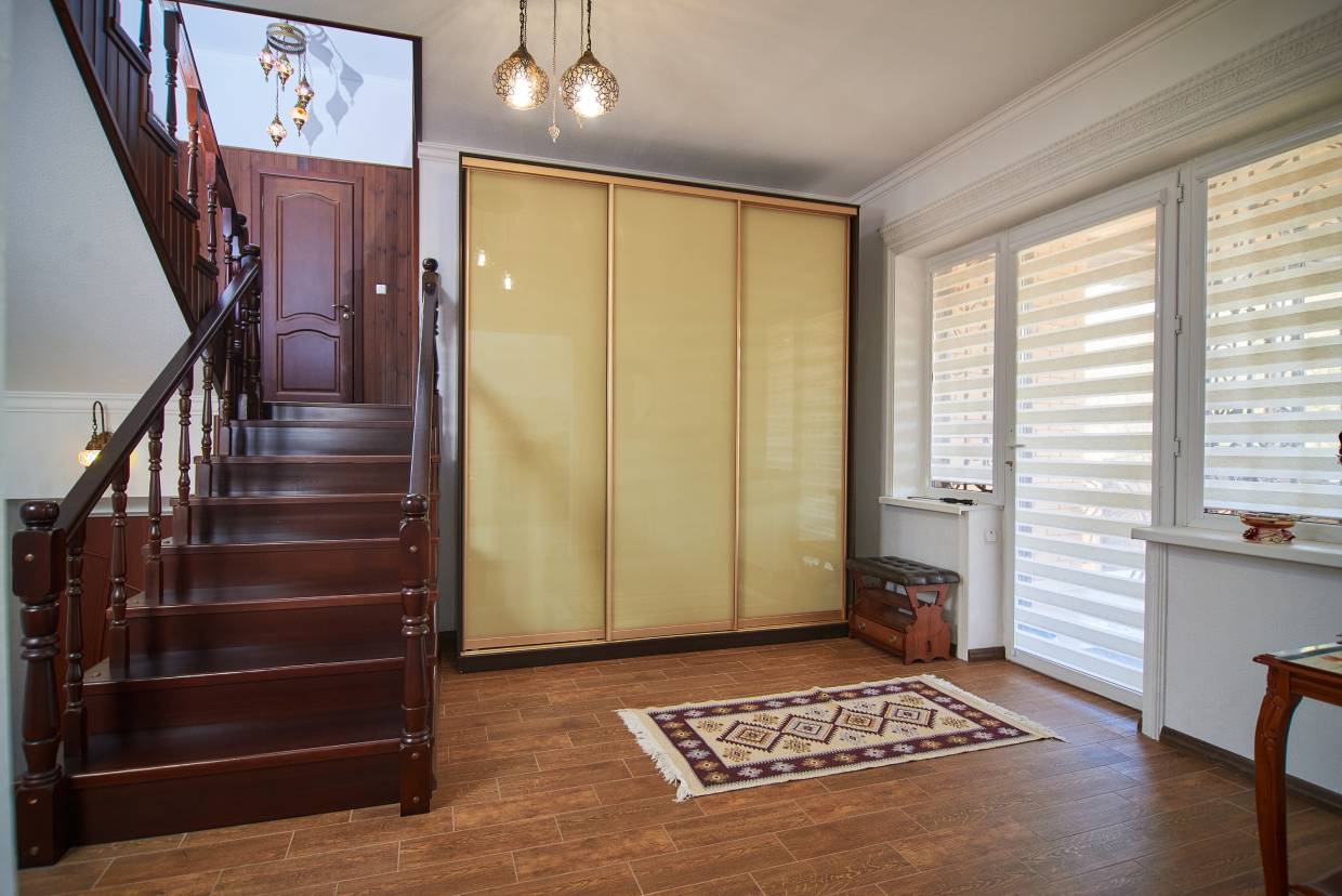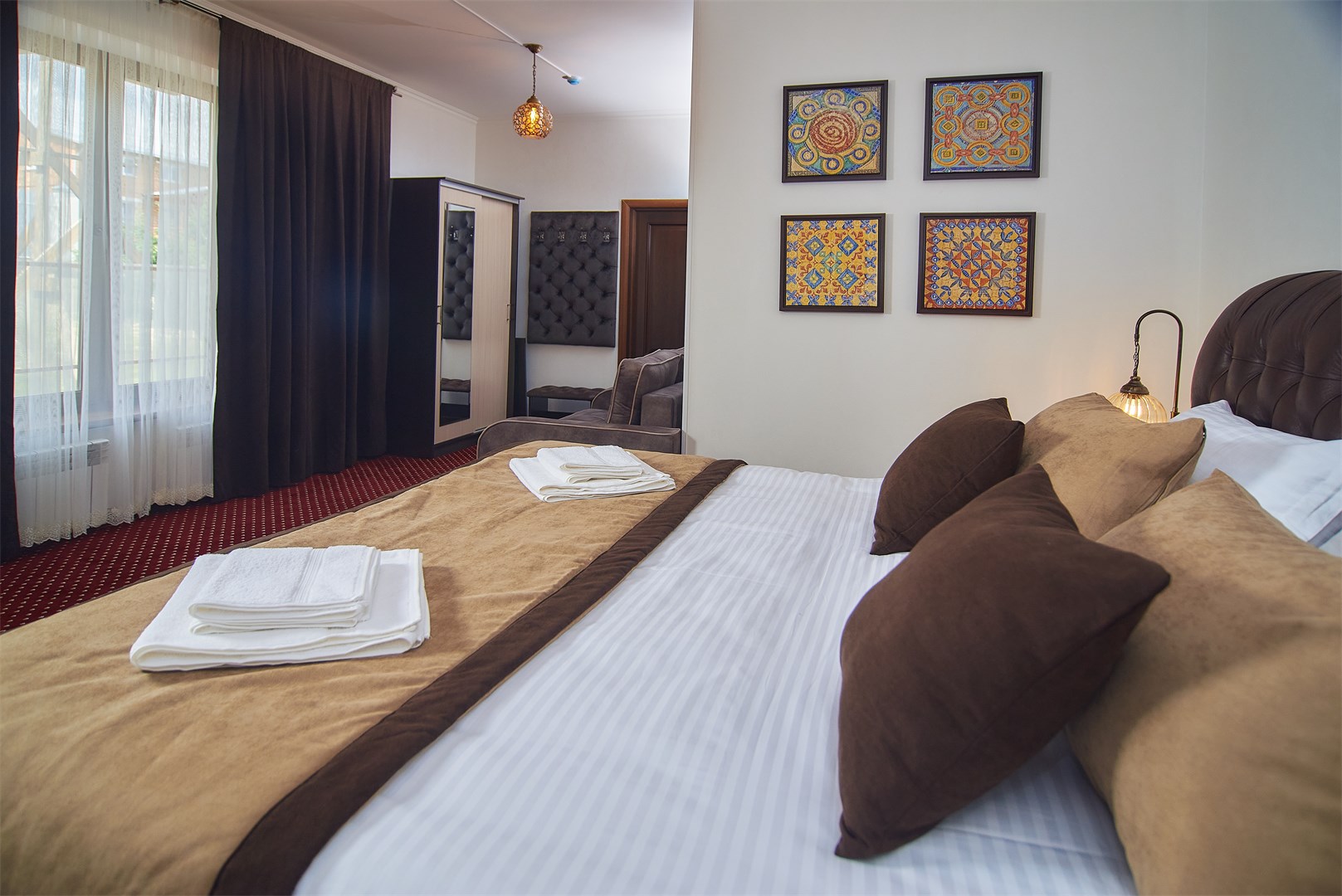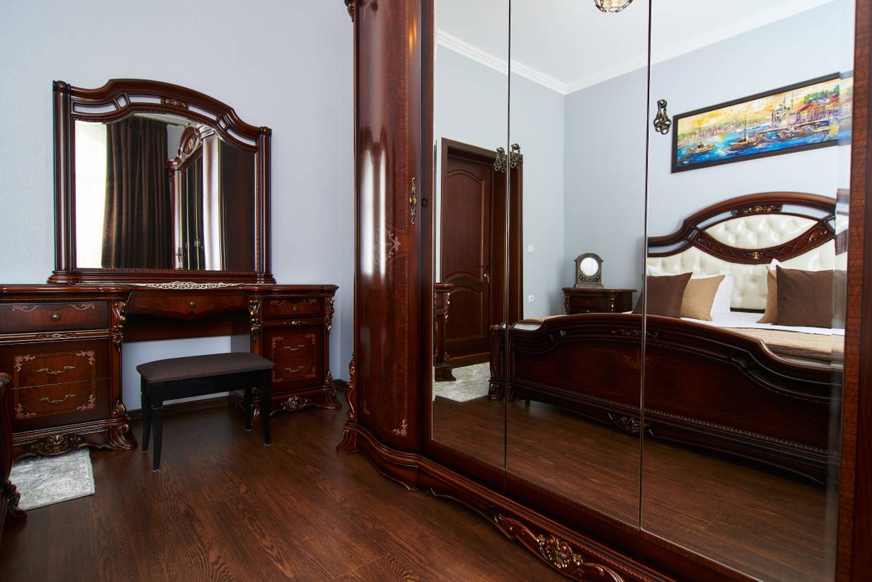 вешалка, диван раскладной, зеркало, кресло, кровать двуспальная, прикроватные тумбочки, стол, стул, шкаф