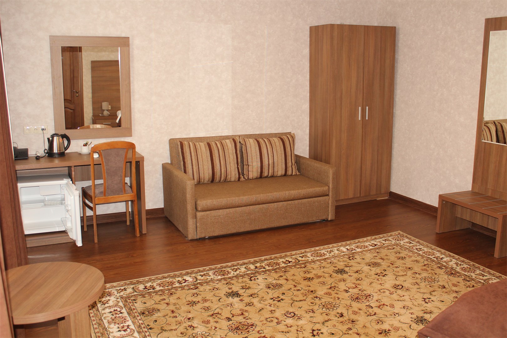 вешалка, диван, зеркало, кровати односпальные /одна двуспальная кровать, прикроватные тумбочки, столик туалетный, стулья, шкаф