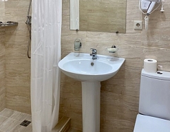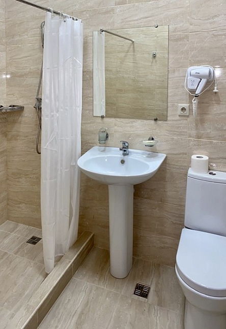 с душем, тапочки, туалетные принадлежности, фен, халат