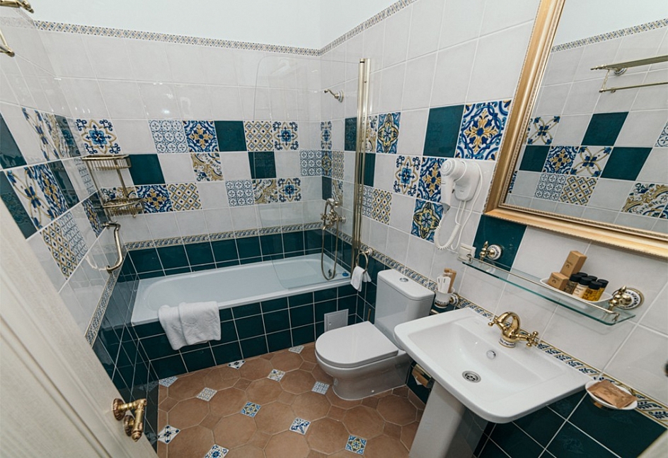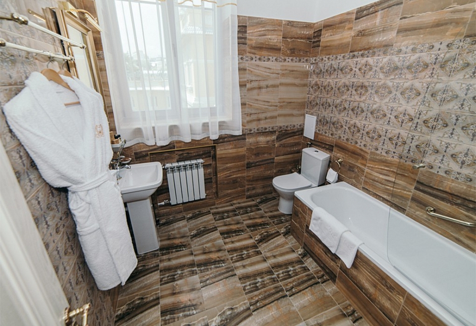 с душем или ванной, тапочки, туалетные принадлежности, фен, халат
