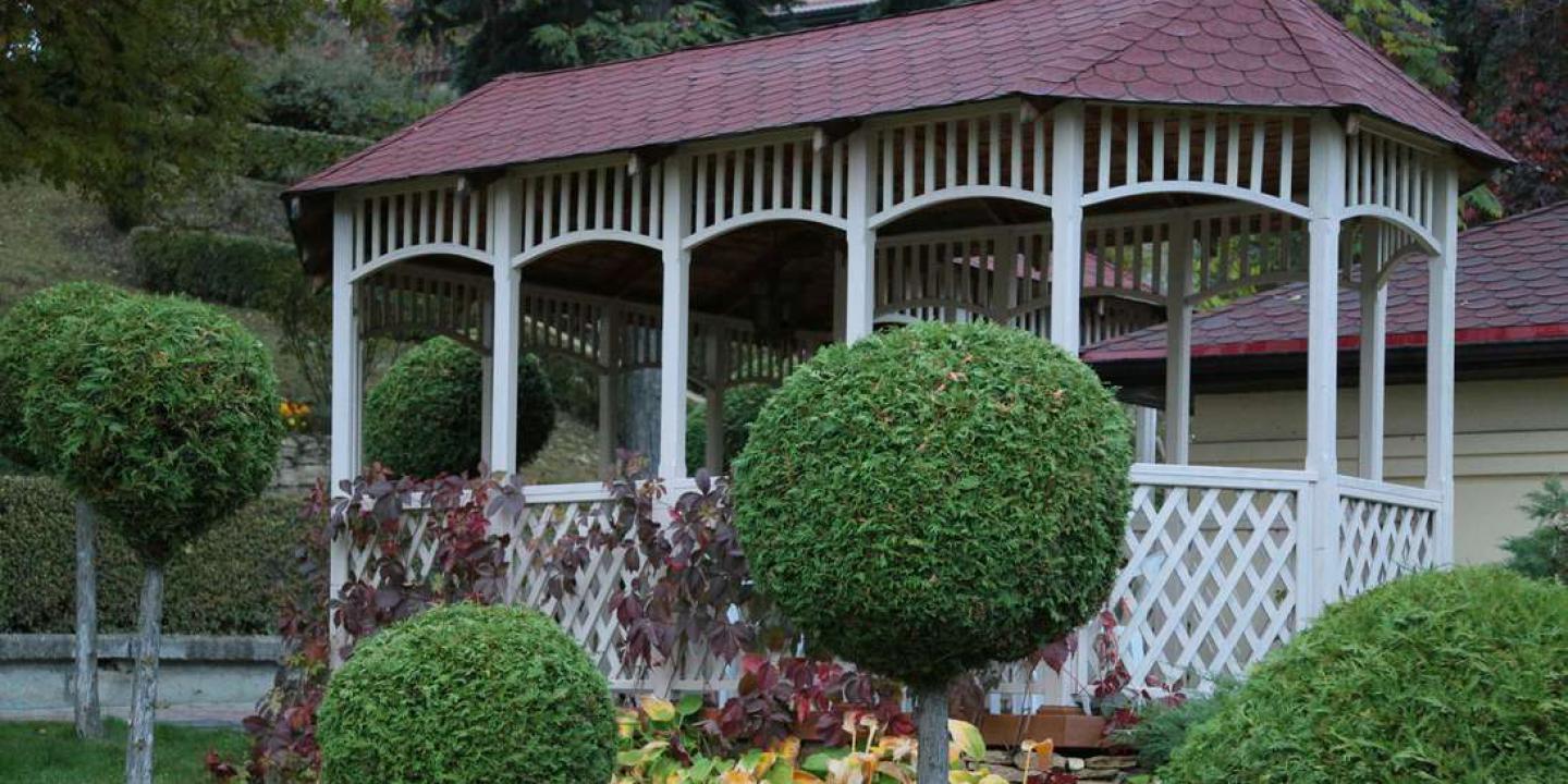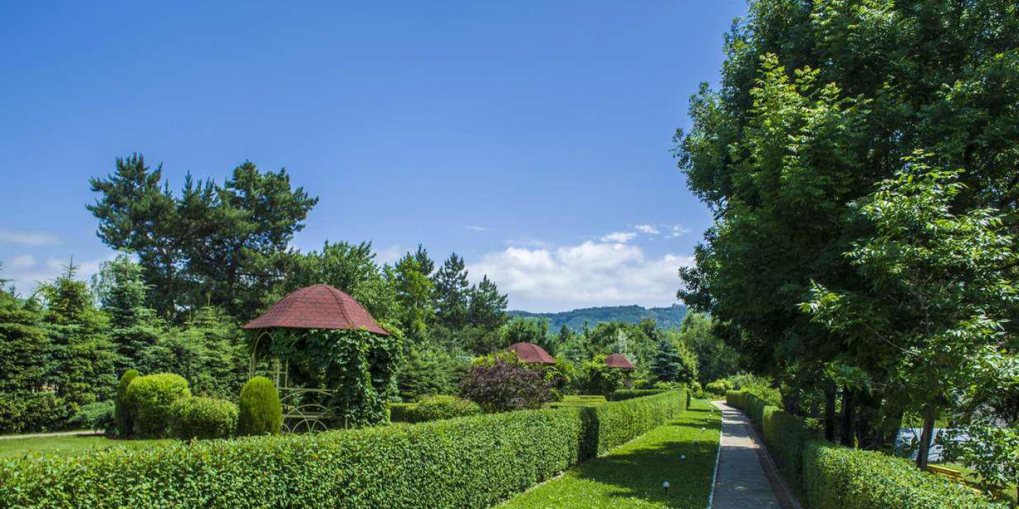 Ландшафтный дизайн территории. "Кругозор" окружен живописными садами и аллеями, создавая уникальную атмосферу для прогулок и отдыха на свежем воздухе.