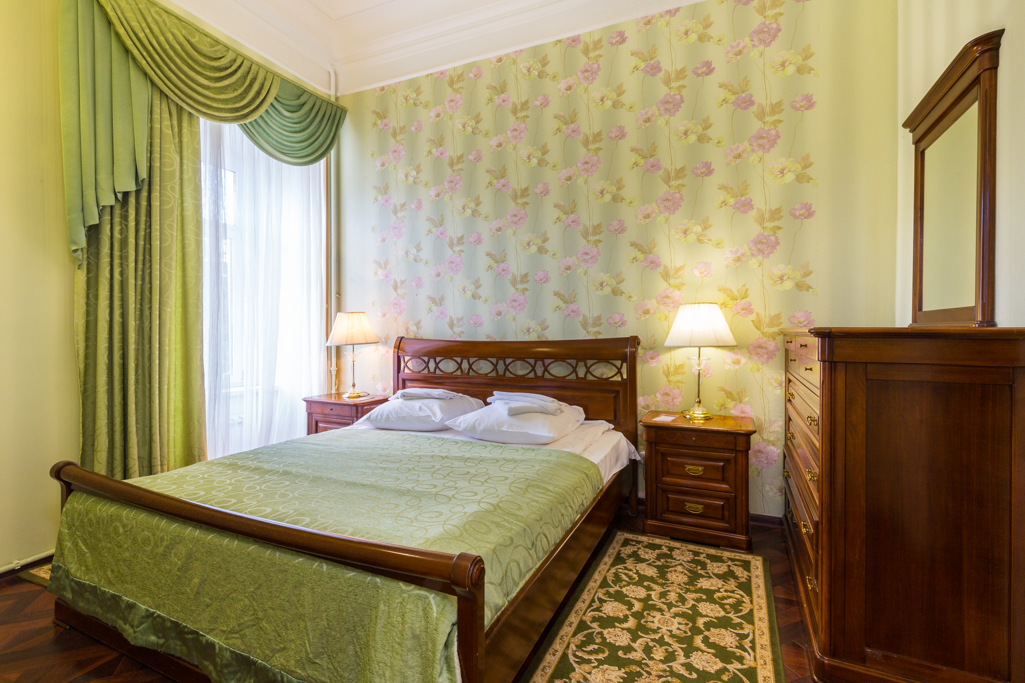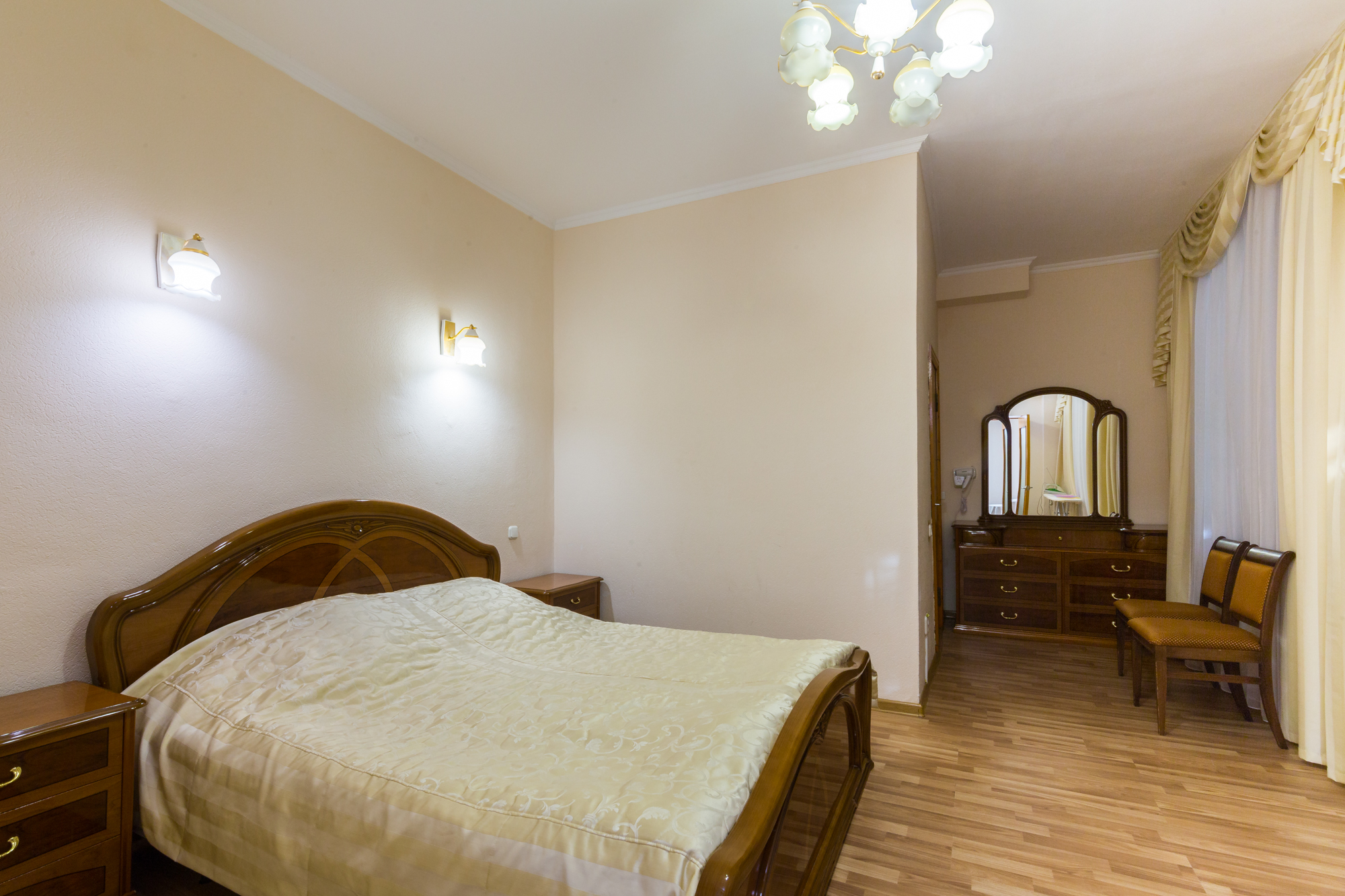 зеркало, кровать двуспальная, набор мягкой мебели, прикроватные тумбочки, стол, стулья, шкаф, шкаф для посуды