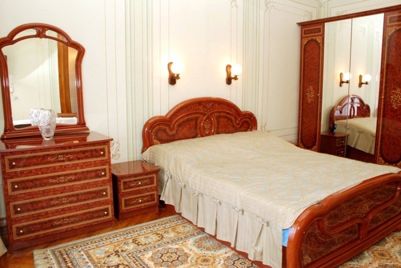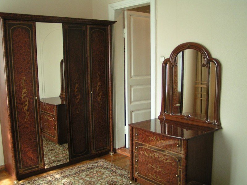 вешалка, диван, зеркало, кресло, кровать двуспальная, прикроватные тумбочки, стол, стулья, шкаф