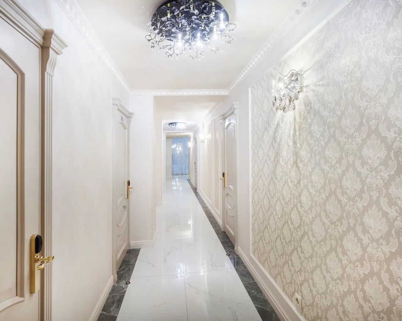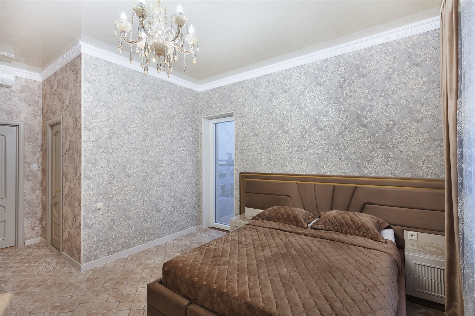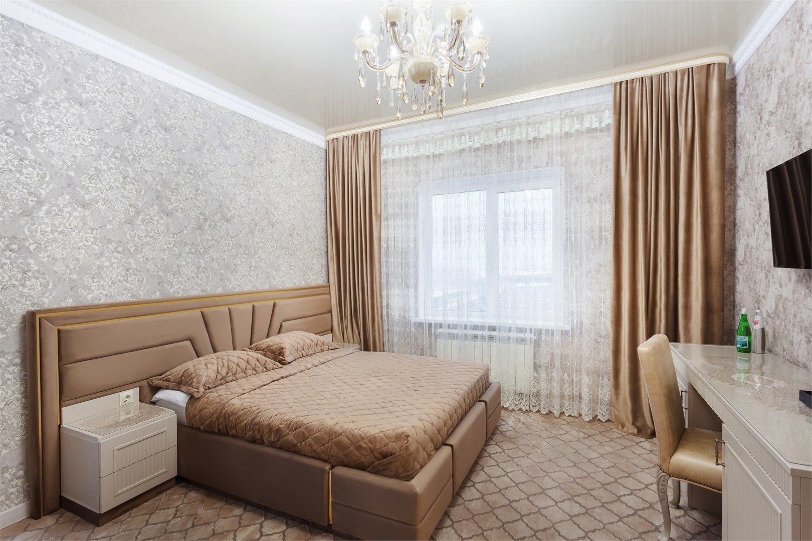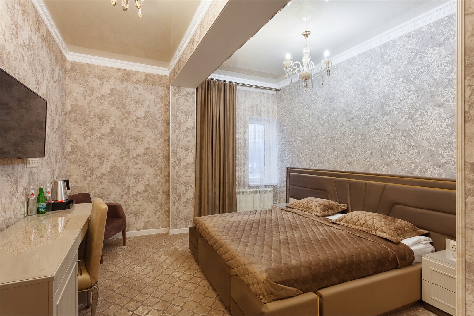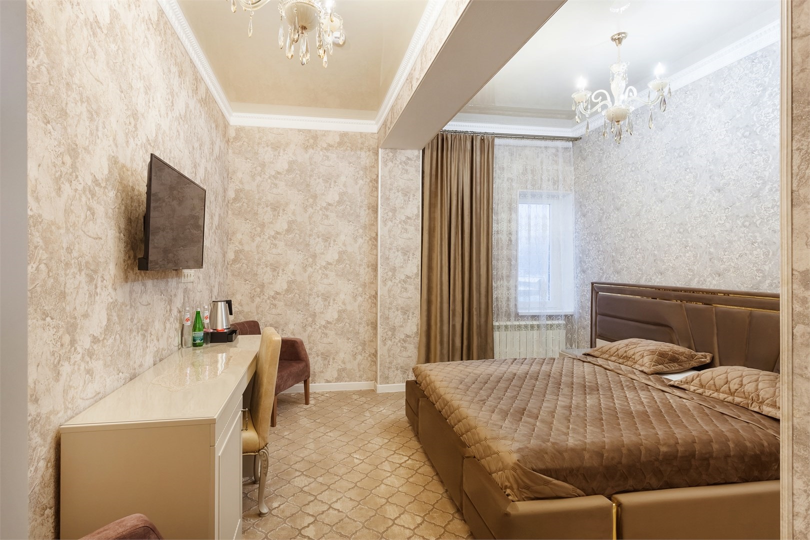 вешалка, зеркало, кровать двуспальная, прикроватные тумбочки, стол, стул, шкаф