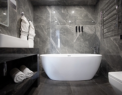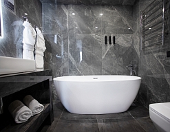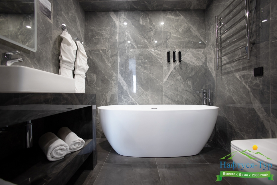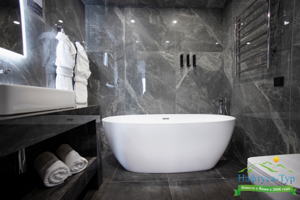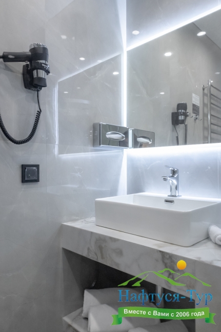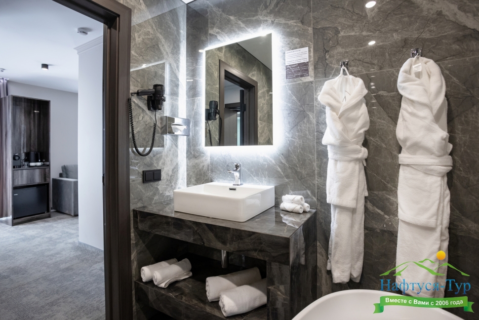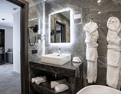 с ванной/душем, тапочки, туалетные принадлежности, фен, халат