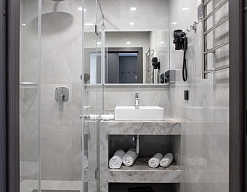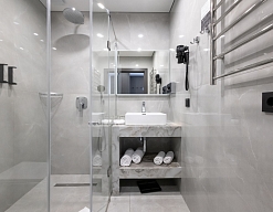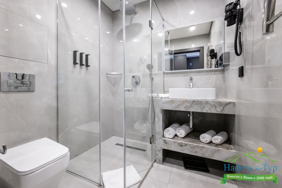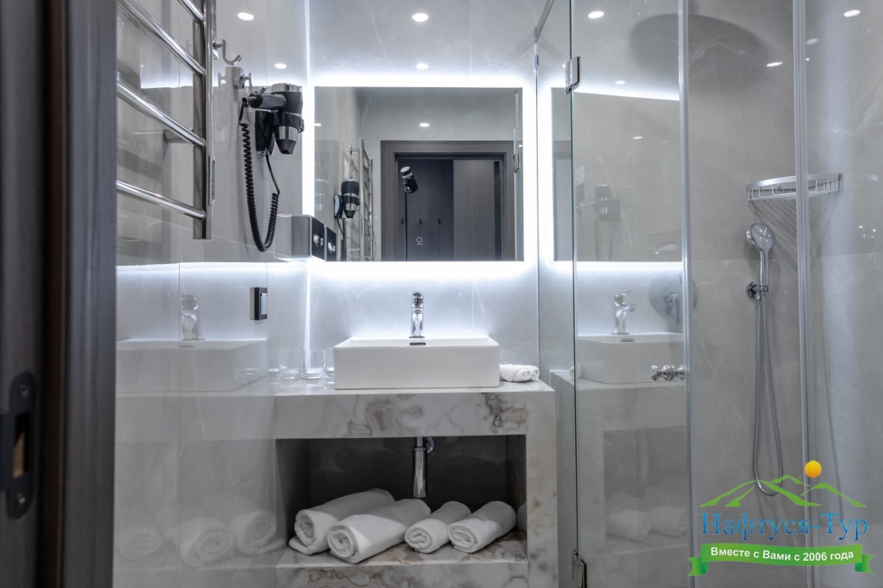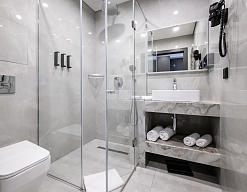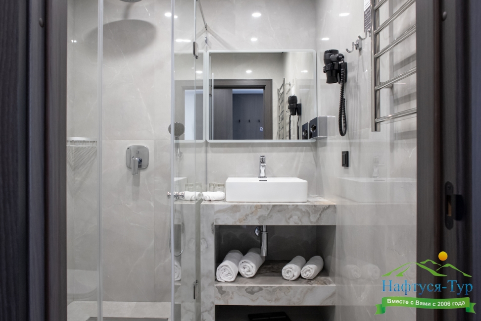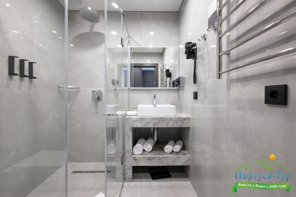 с душевой кабиной, тапочки, туалетные принадлежности, фен, халат