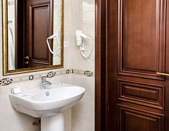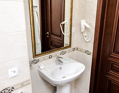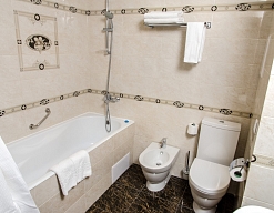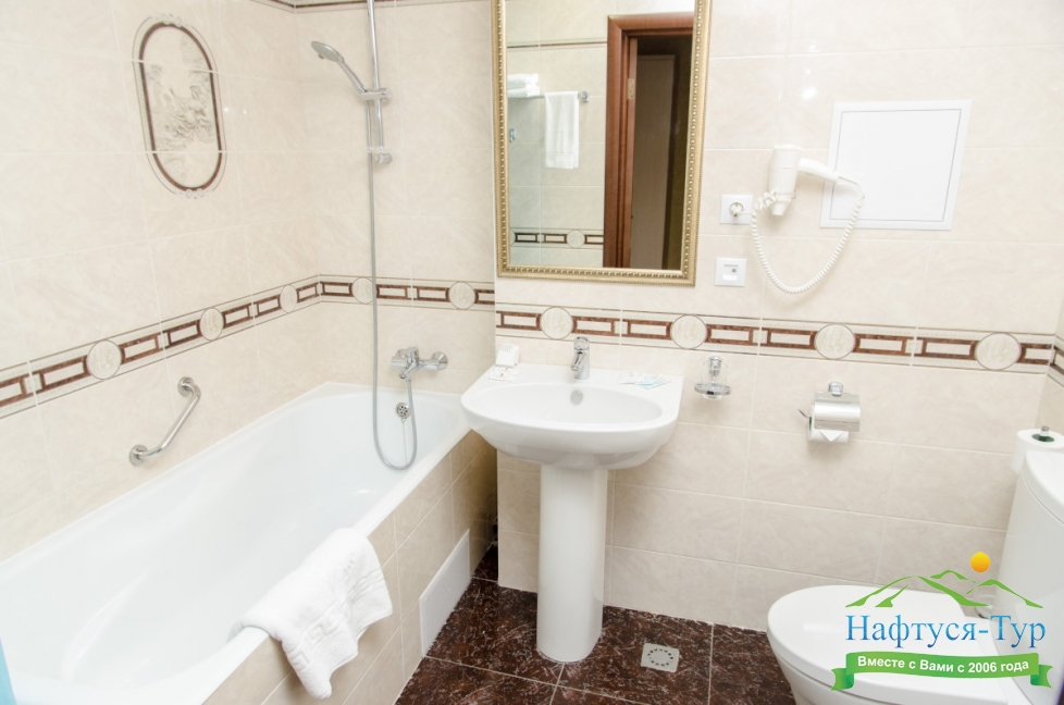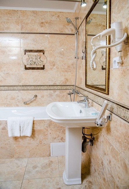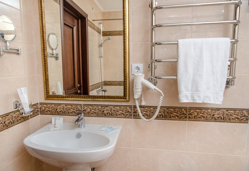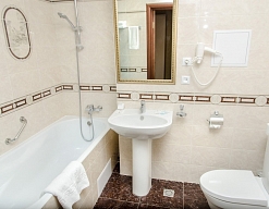 с ванной, с душем, тапочки, туалетные принадлежности, фен, халат