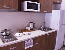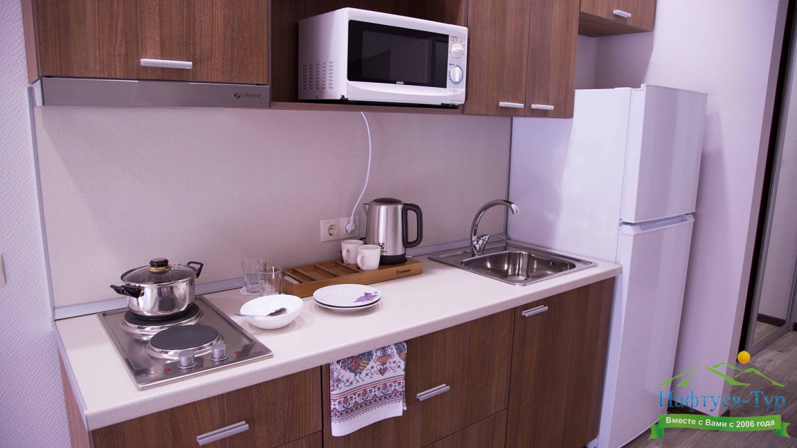 кондиционер, микроволновая печь, набор посуды, стиральная машина, телевизор, телефон, холодильник, электрическая плита, электрочайник