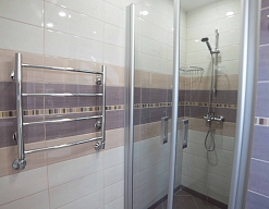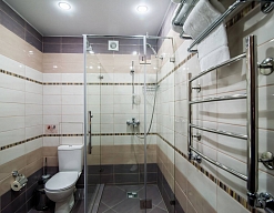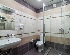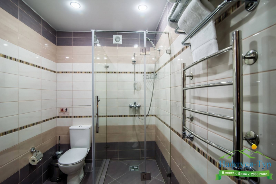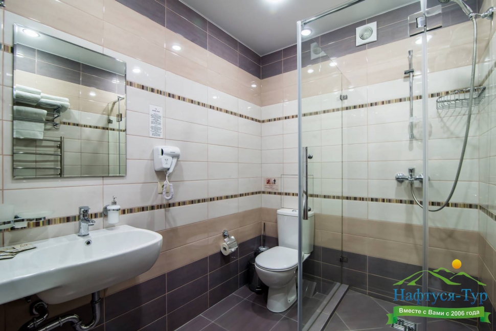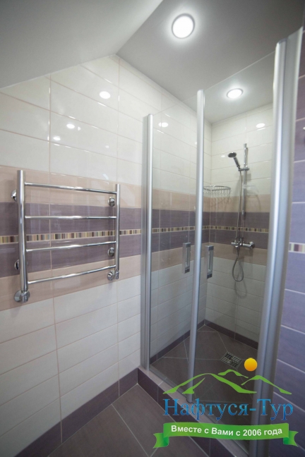 с душевой кабиной, тапочки, фен