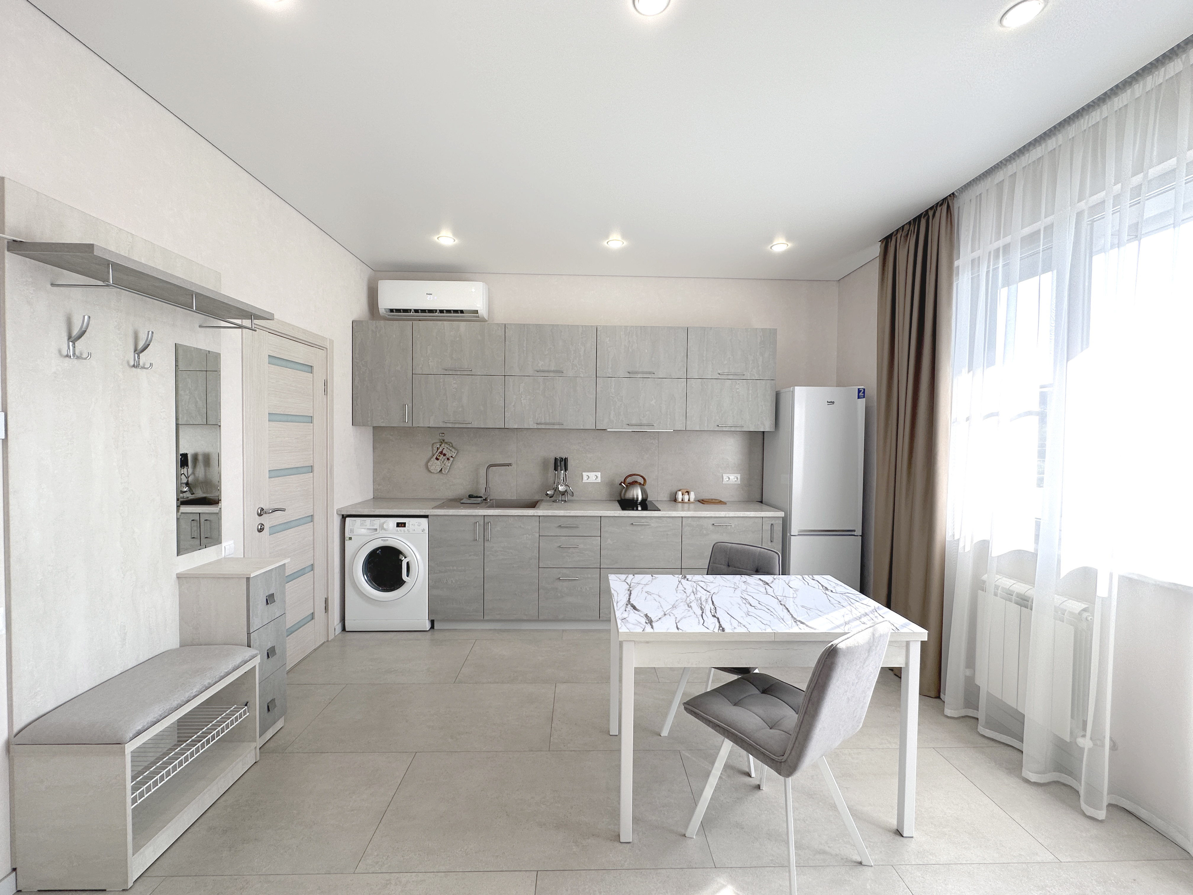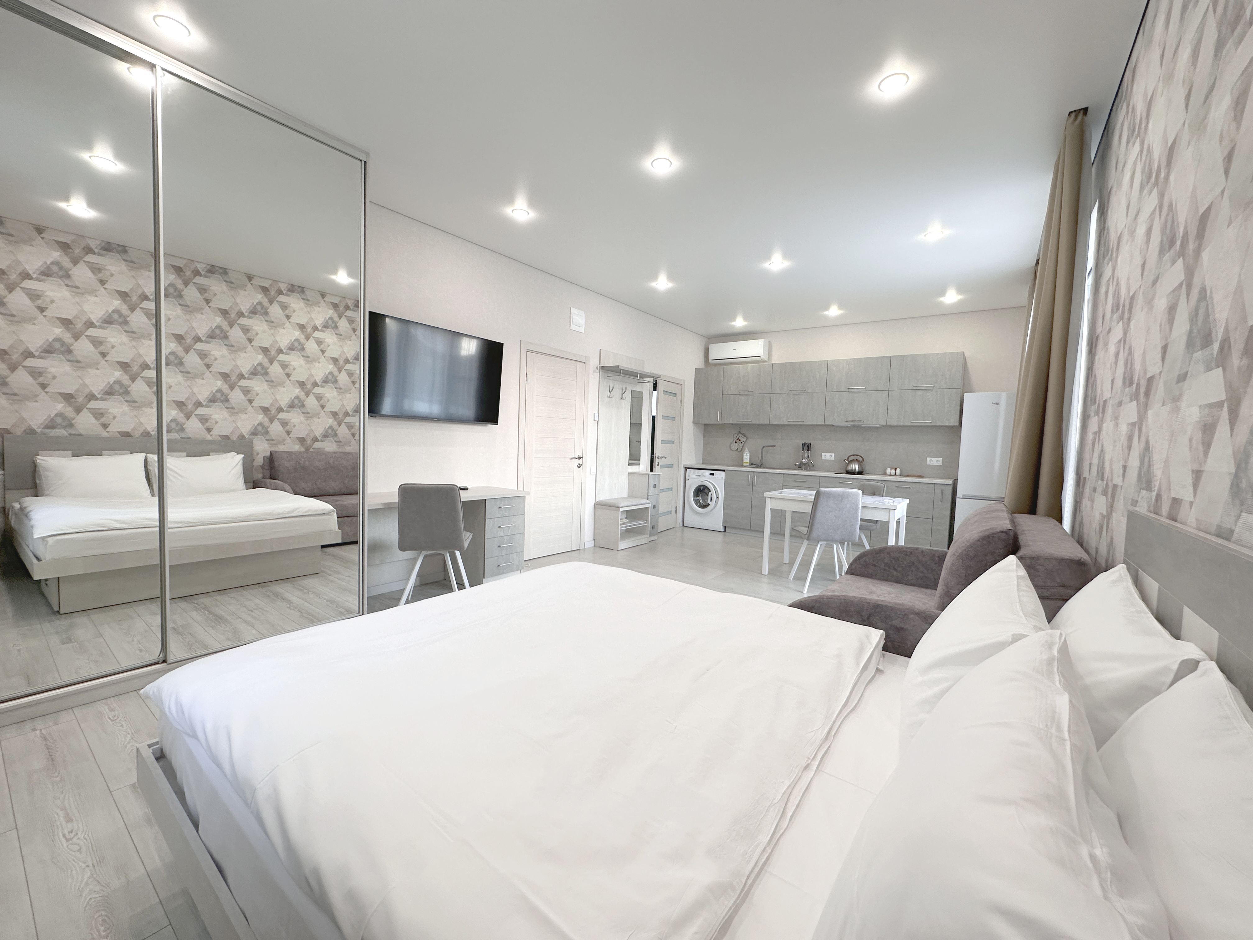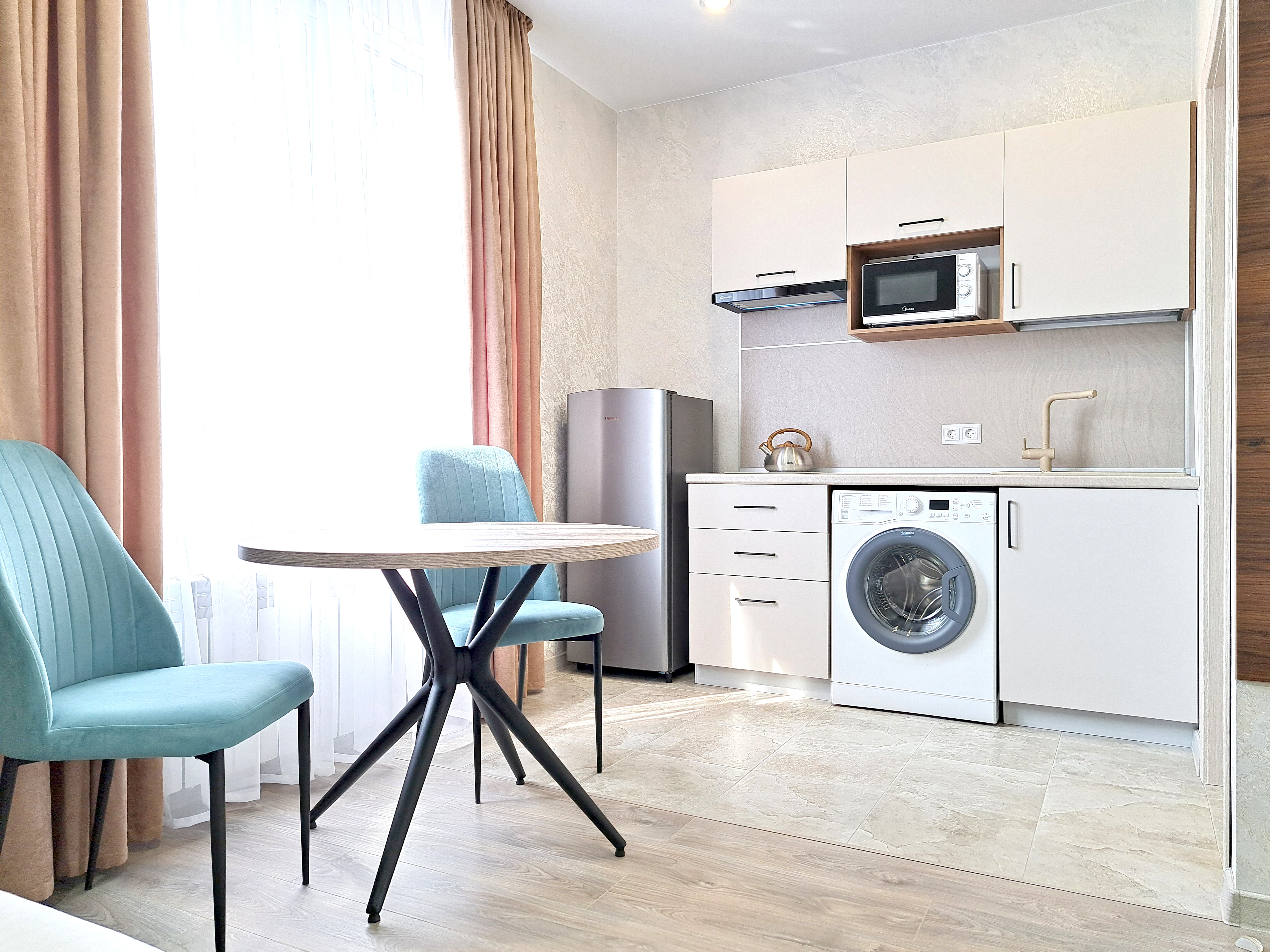 гладильная доска, кондиционер, микроволновая печь, набор посуды, плита электрическая, стиральная машина, телевизор ЖК, утюг, холодильник