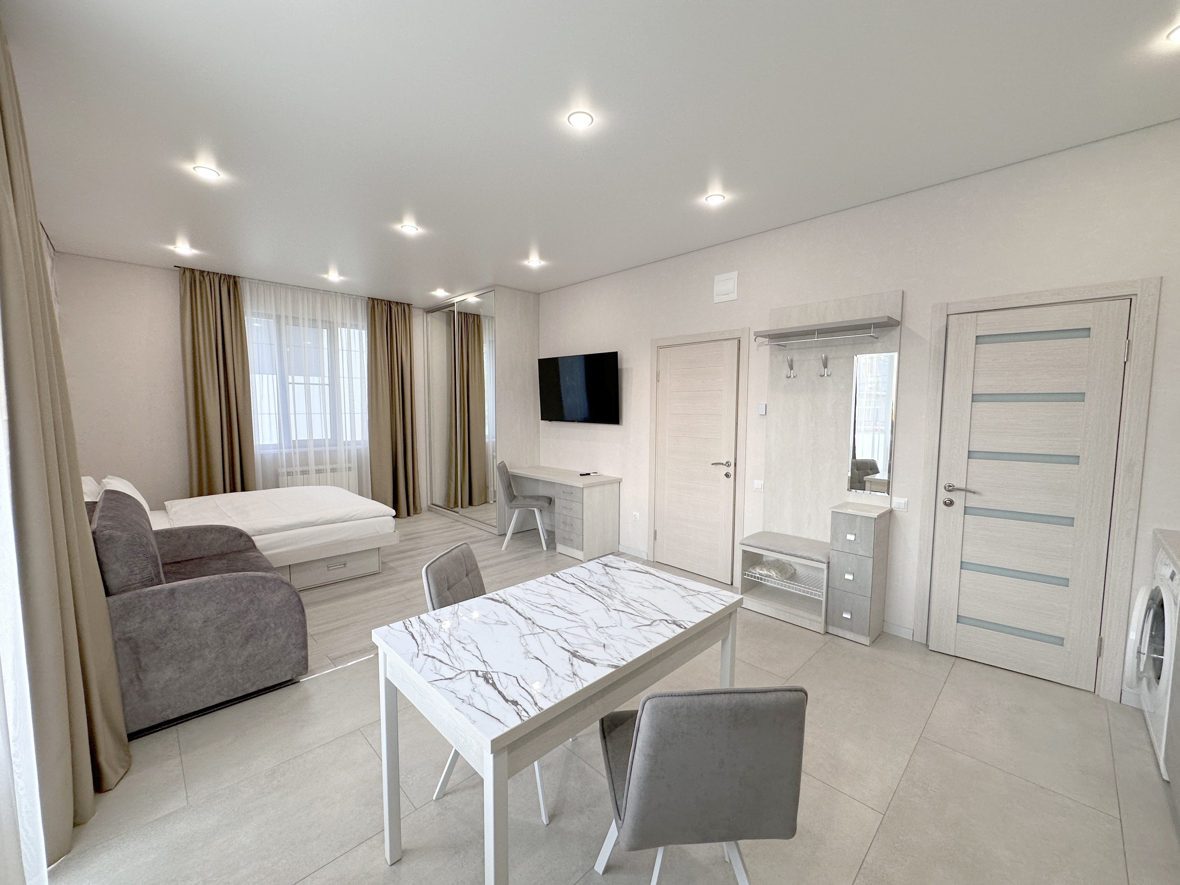 вешалка, зеркало, кровать двуспальная, стол обеденный, стулья, шкаф
