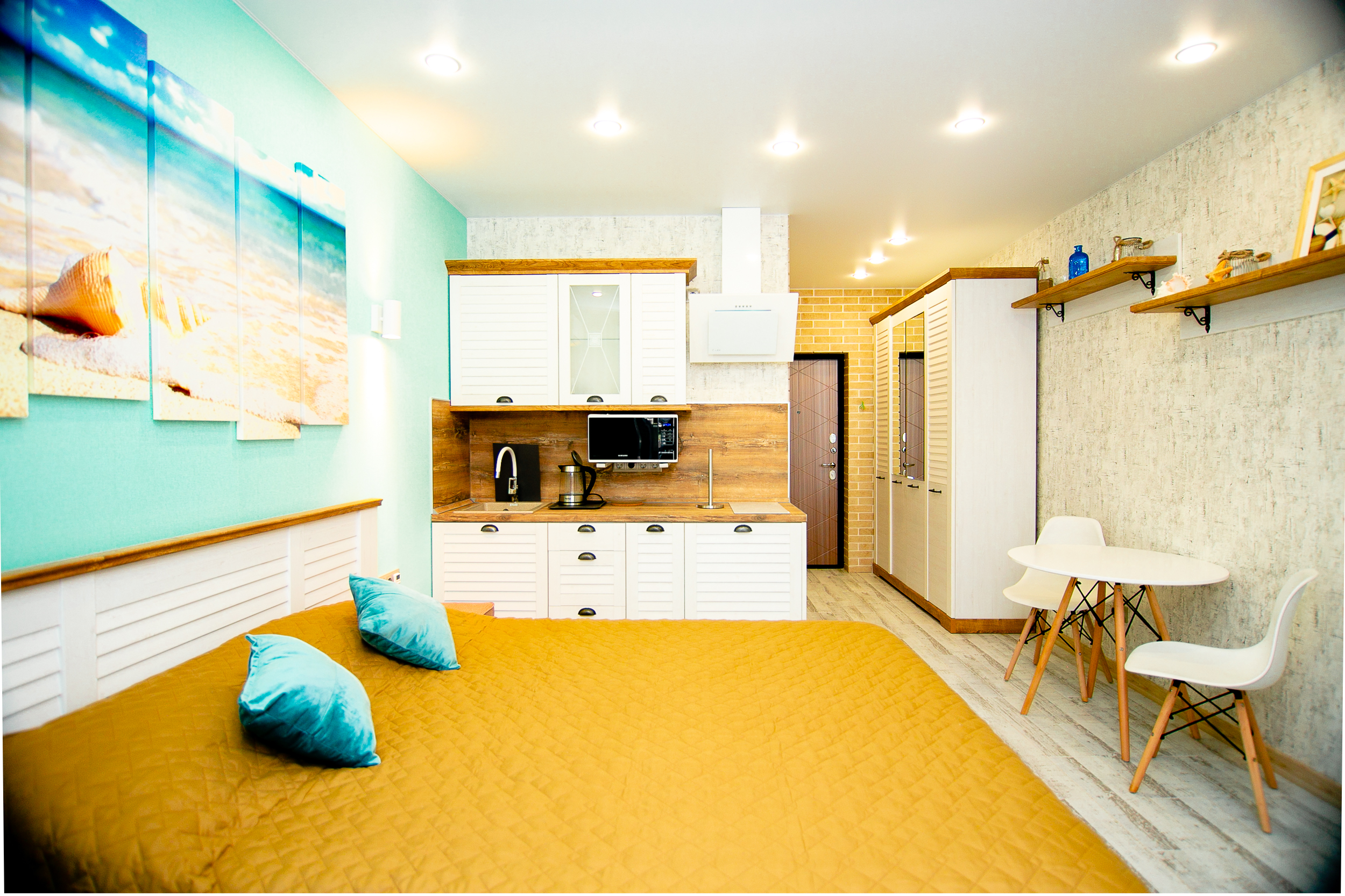 вешалка, диван раскладной, зеркало, кровати односпальные, кровать двуспальная, кухонная мебель, стол, стулья, шкаф