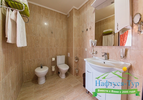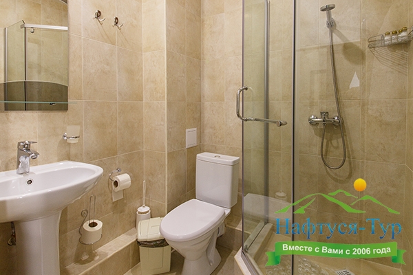 с душевой кабиной, тапочки, туалетные принадлежности, фен, халат