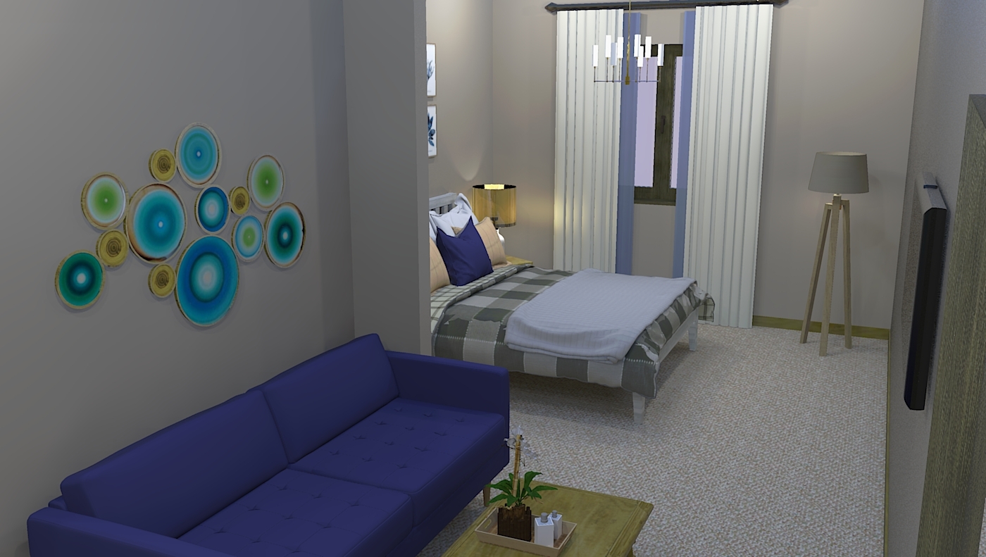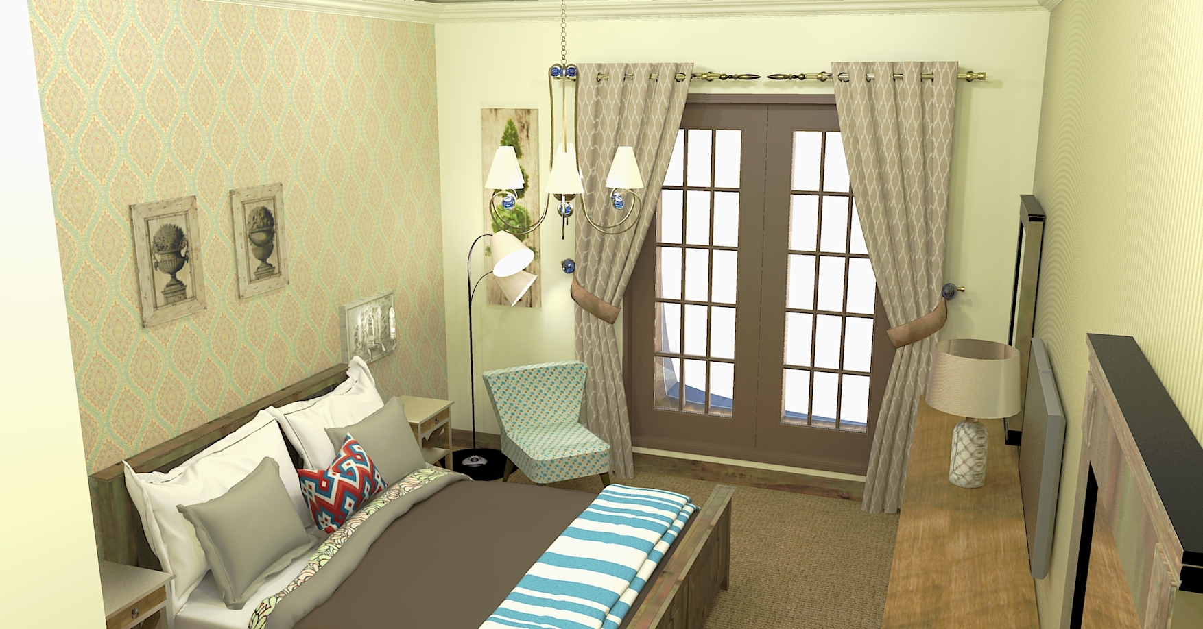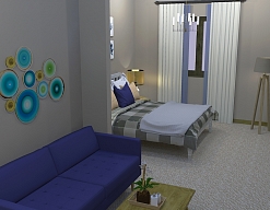 вешалка, зеркало, кресло-кровать, кровать двуспальная, прикроватные тумбочки, стол, стулья, шкаф