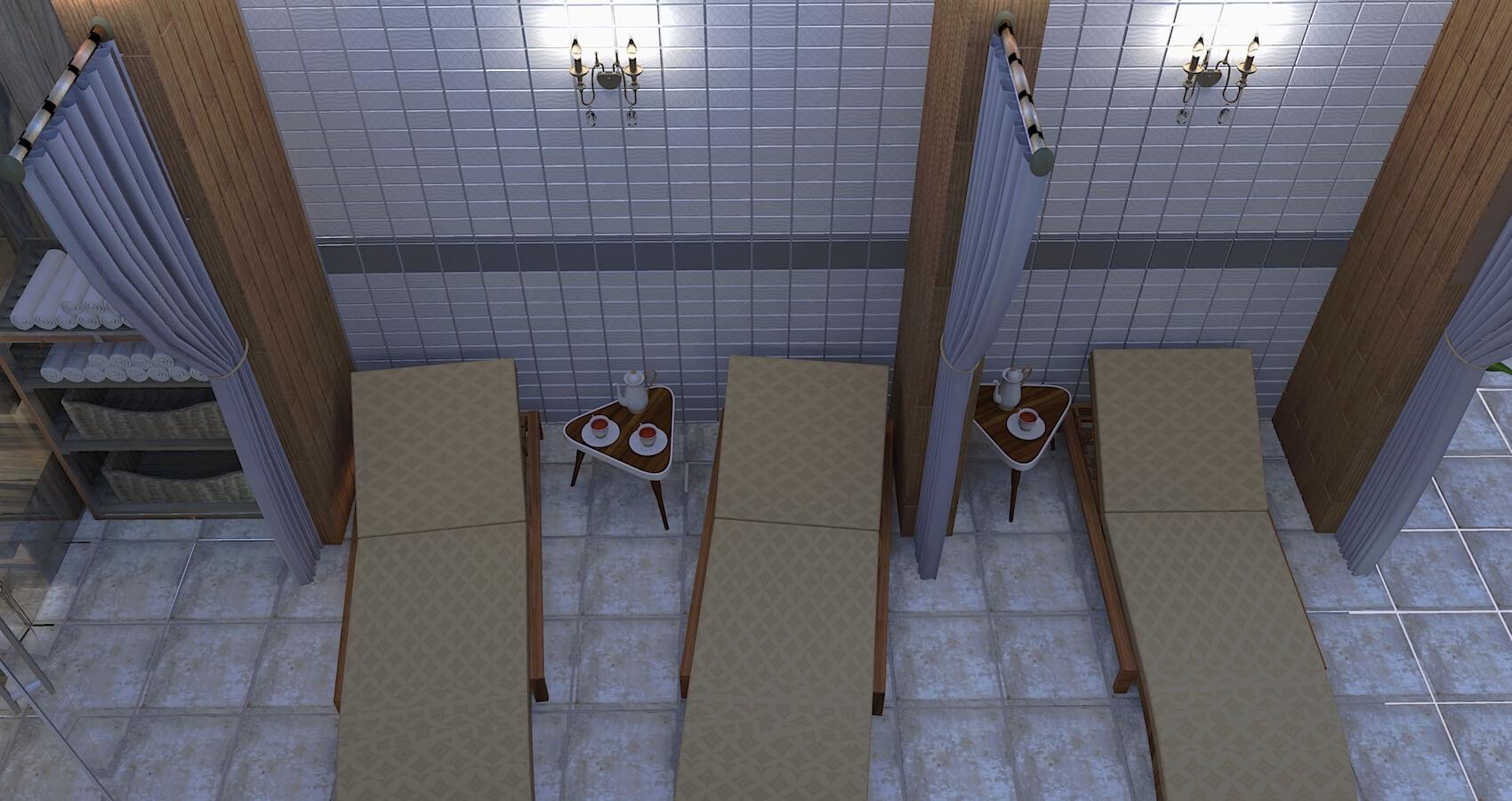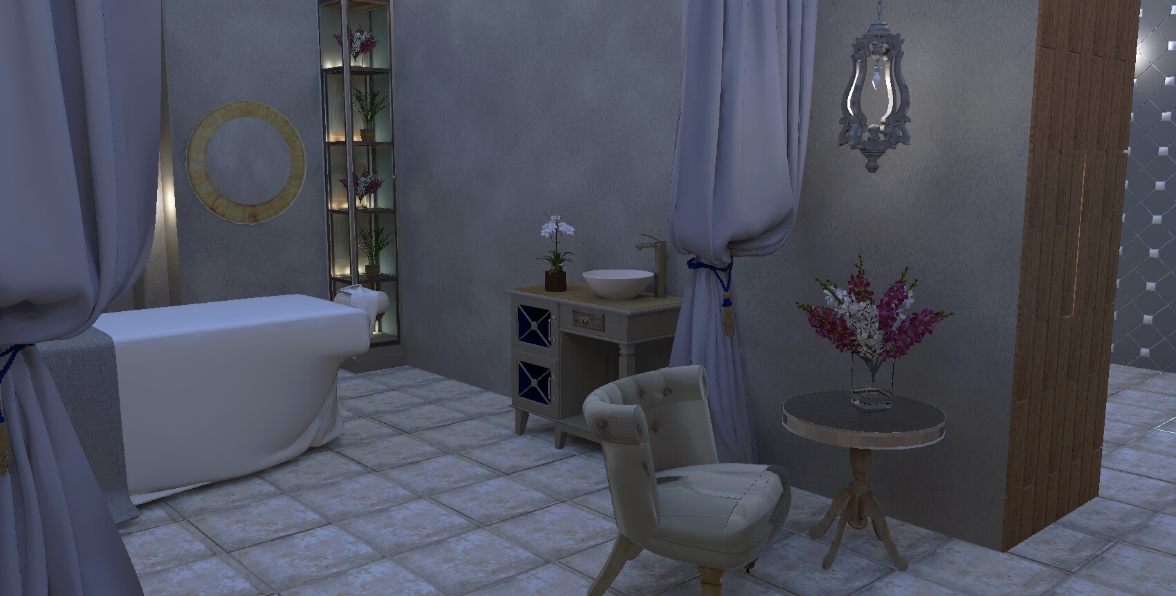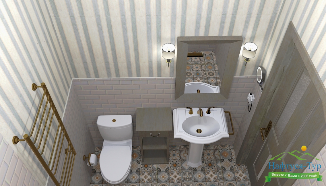с душем (поддон), тапочки, туалетные принадлежности, фен, халат