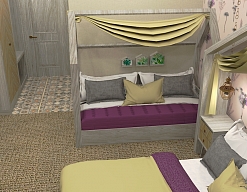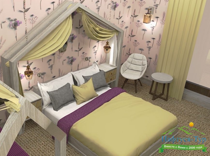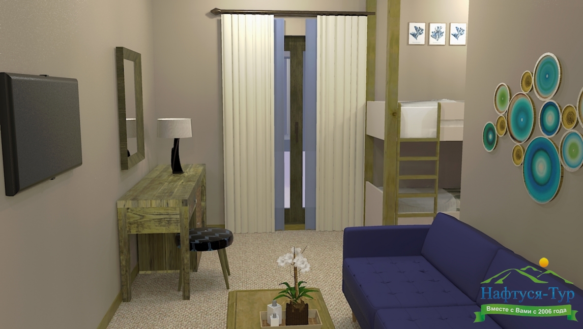 вешалка, зеркало, кресло-кровать, кровать двуспальная, кровать двухъярусная, прикроватные тумбочки, стол, стулья, шкаф
