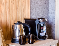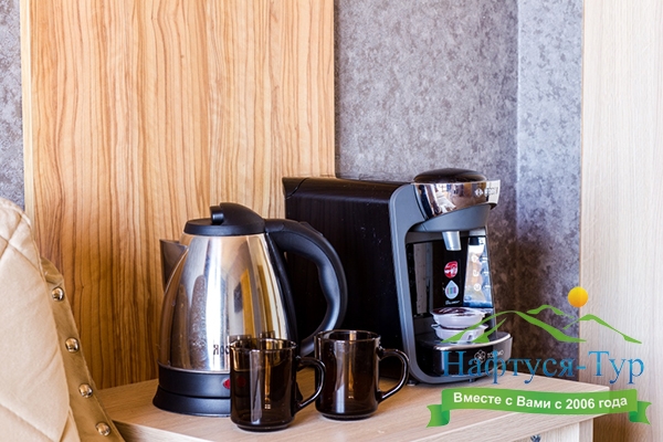 кофемашина, сейф, система общего кондиционирования, телевизор ЖК, телефон, чайный набор посуды, электрочайник