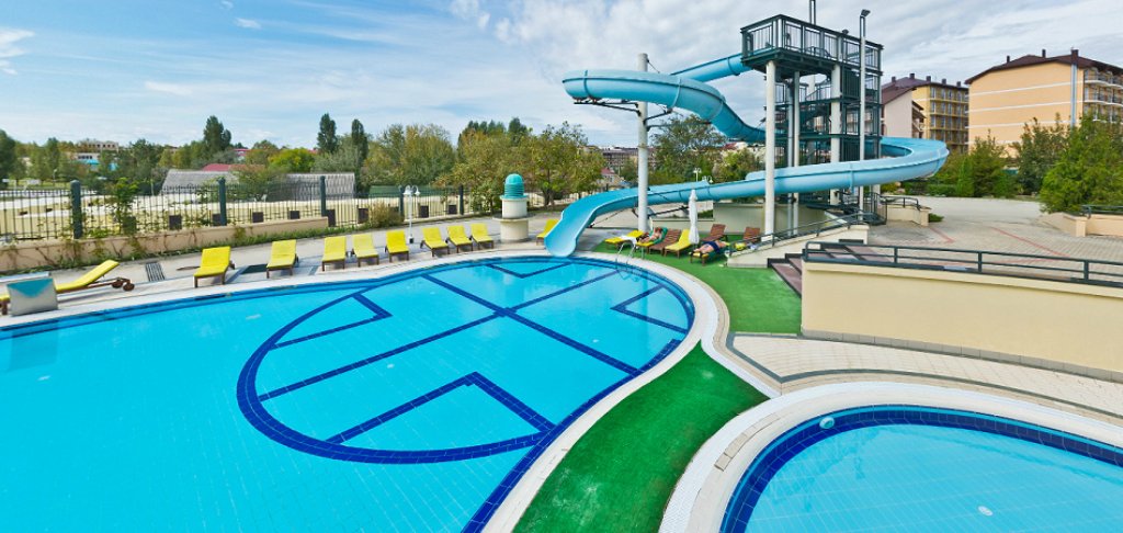 - открытый: 415 кв. м, вода пресная, горки, детское отделение.