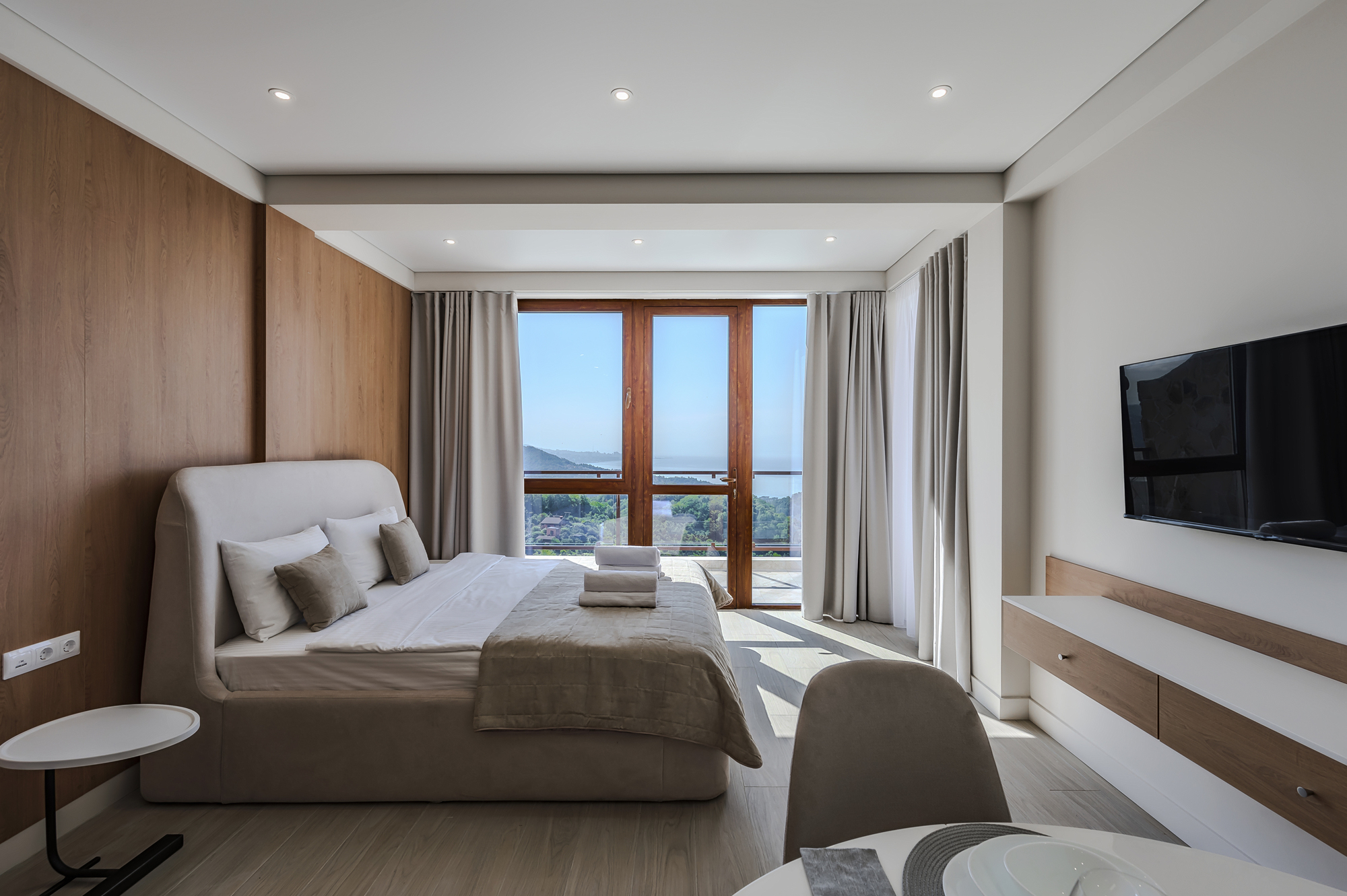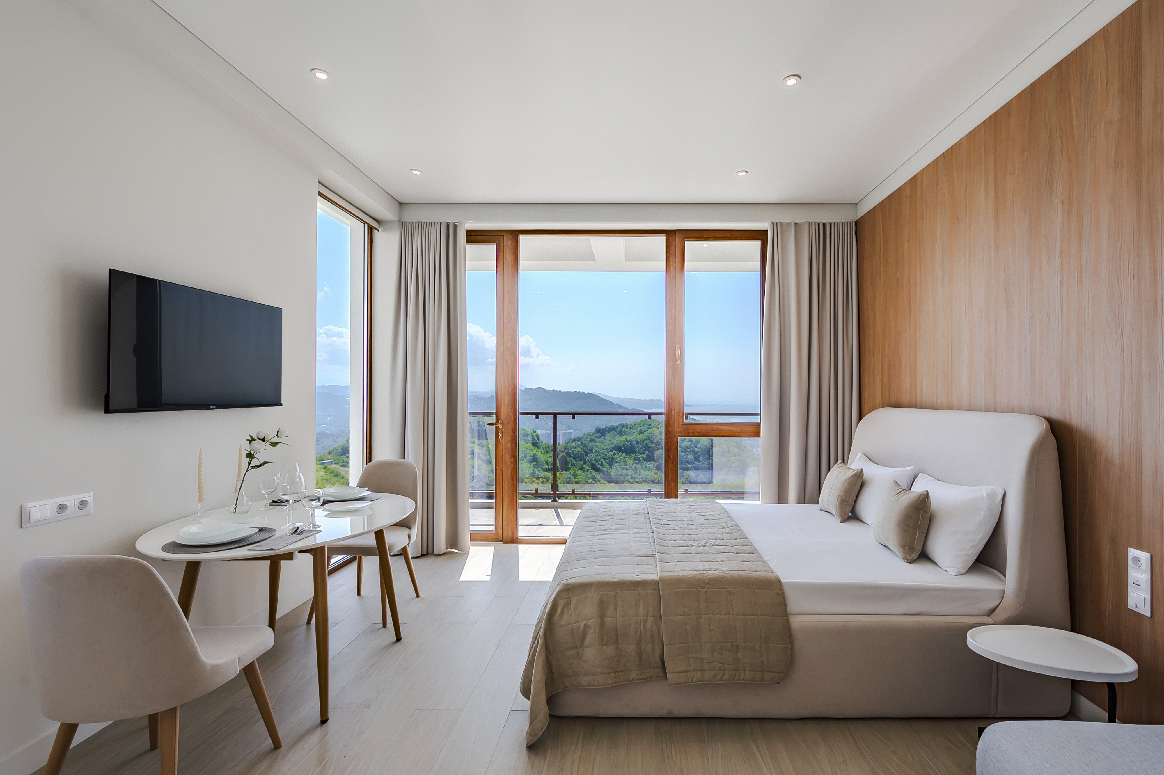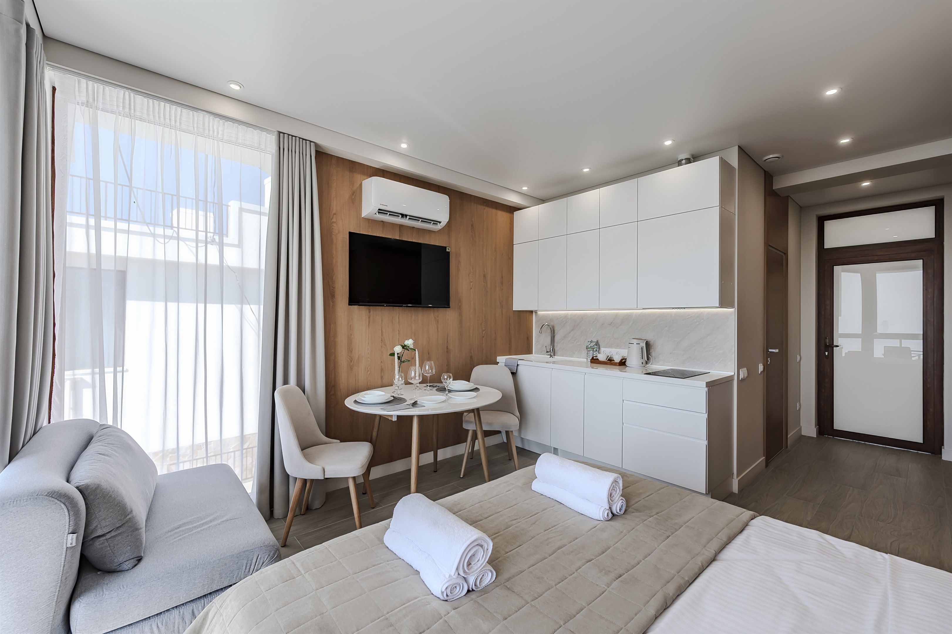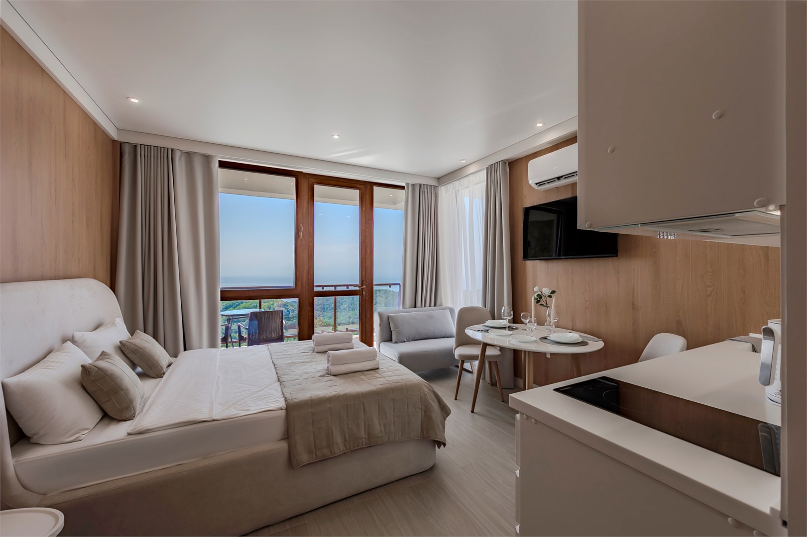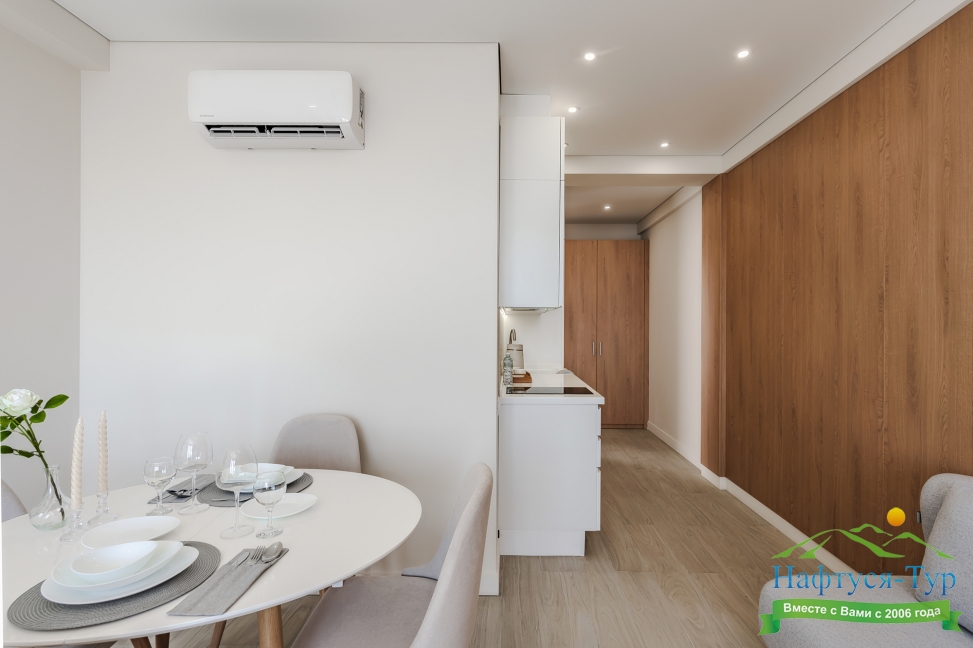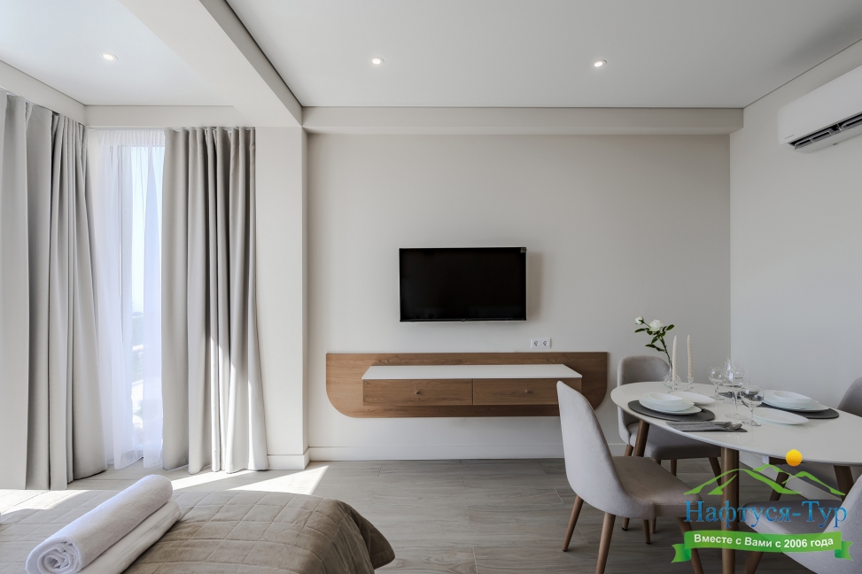 гладильная доска, кондиционер, набор посуды, плита электрическая, пляжные полотенца, сейф, стиральная машина, телевизор ЖК, утюг, холодильник, чайная станция