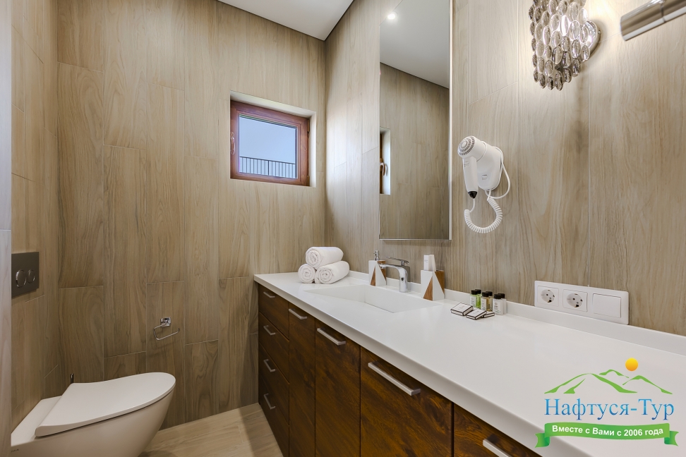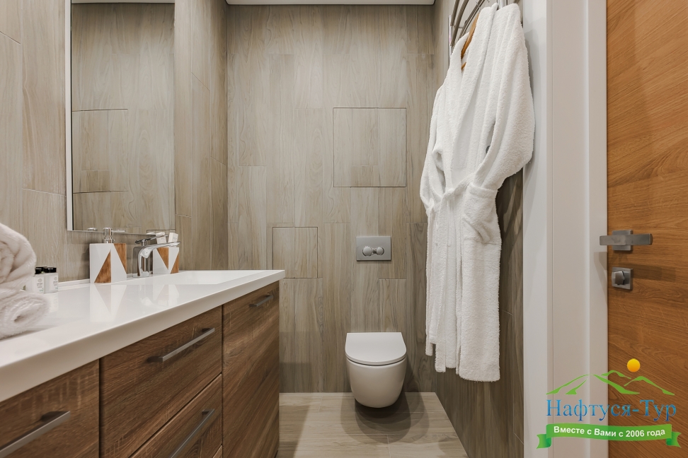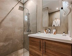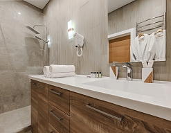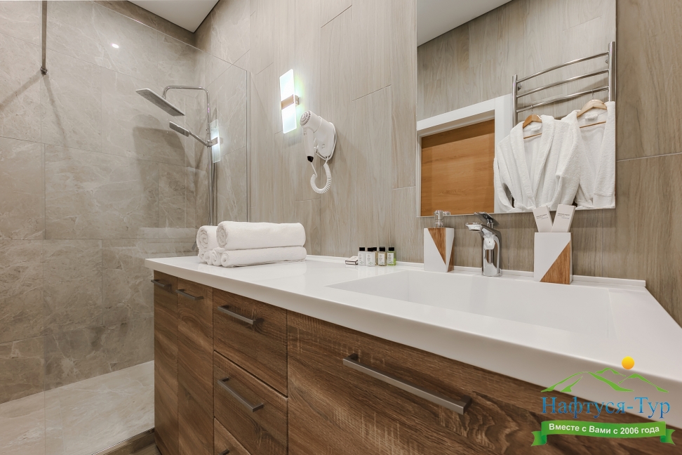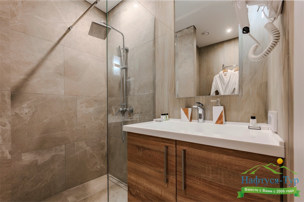 с душевой кабиной, тапочки, туалетные принадлежности, фен, халат