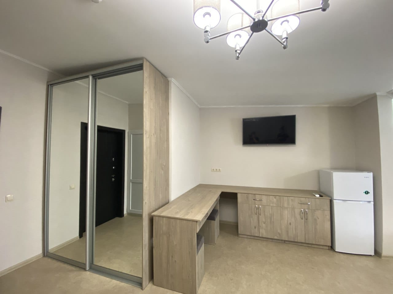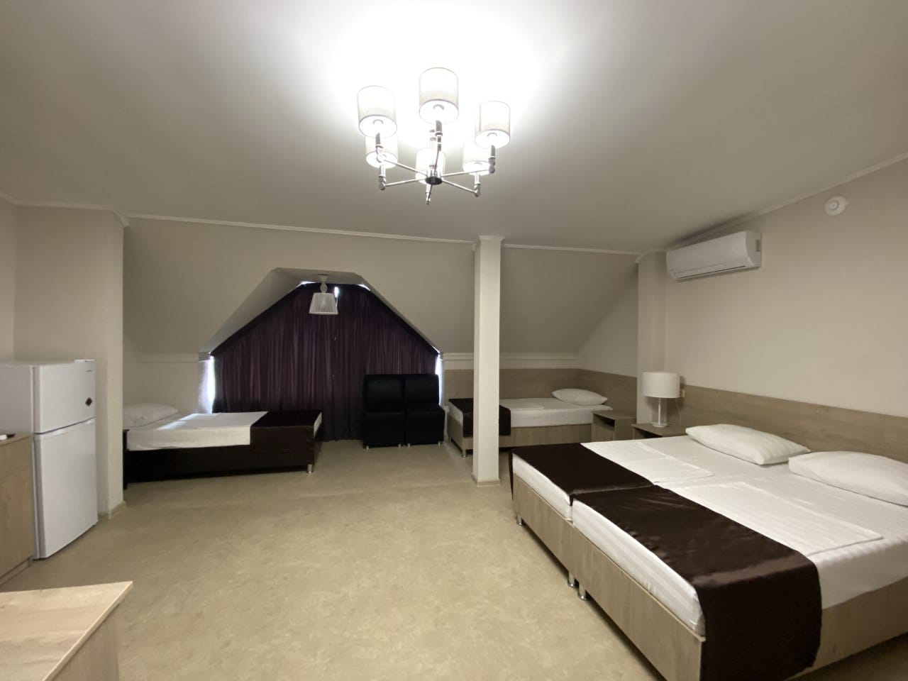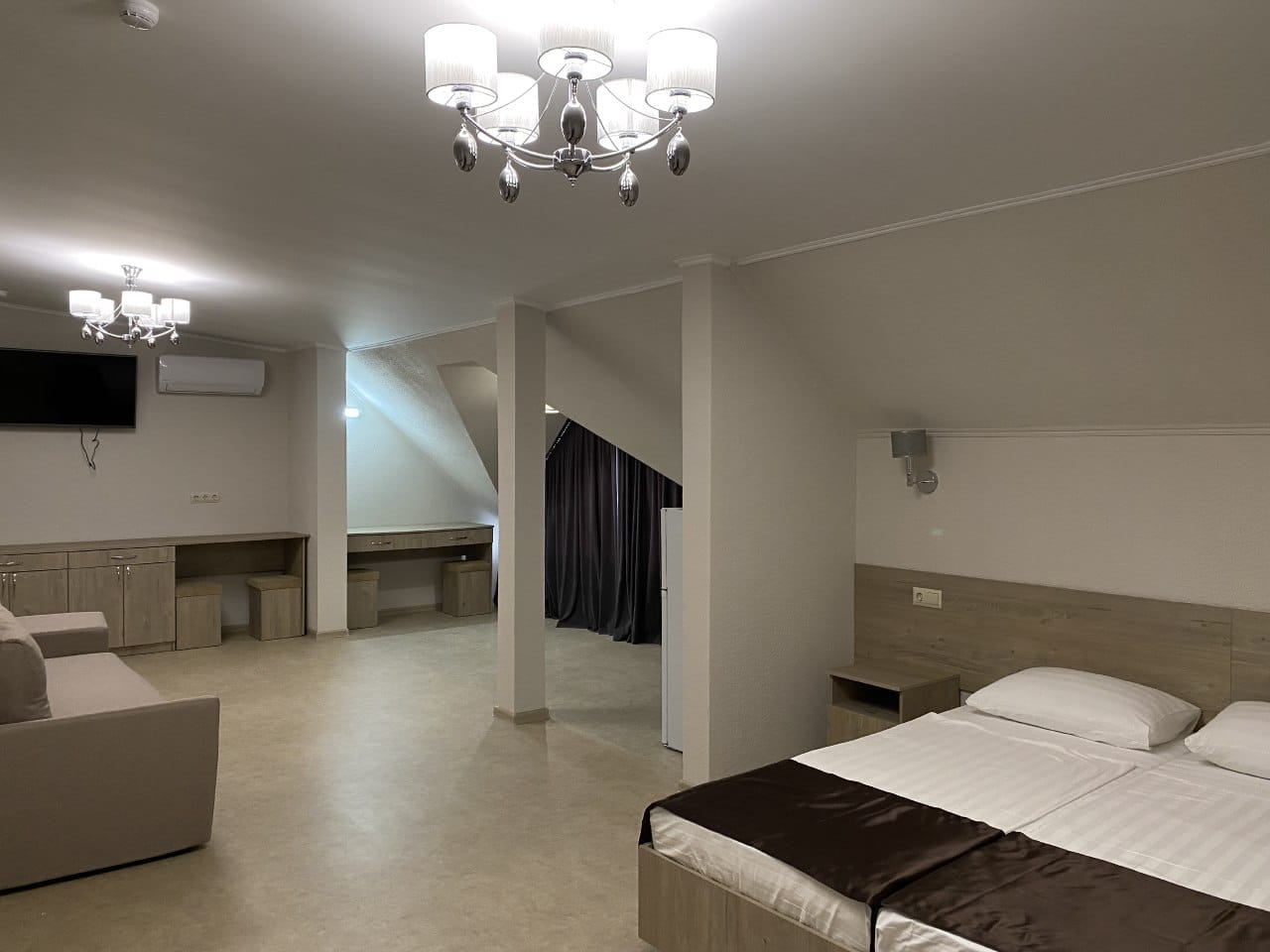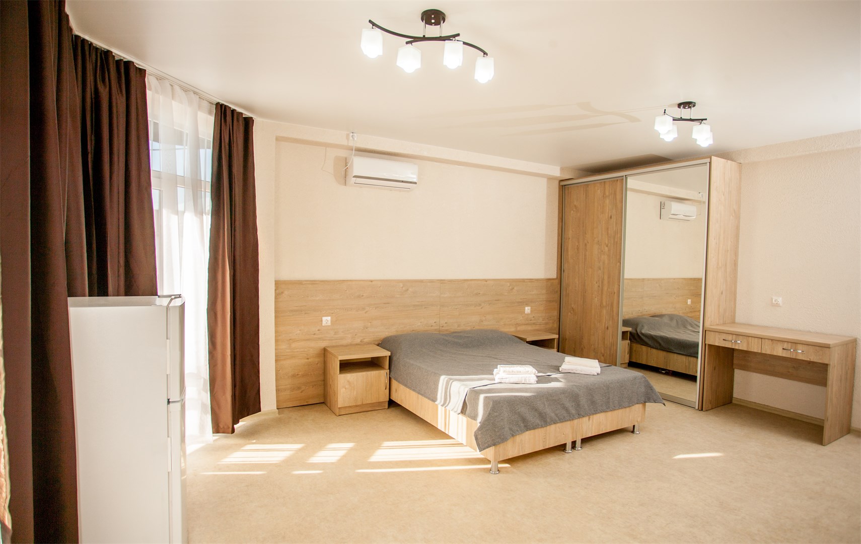 вешалка, диван, зеркало, кровати односпальные /одна двуспальная кровать, прикроватные тумбочки, стол, стул, шкаф