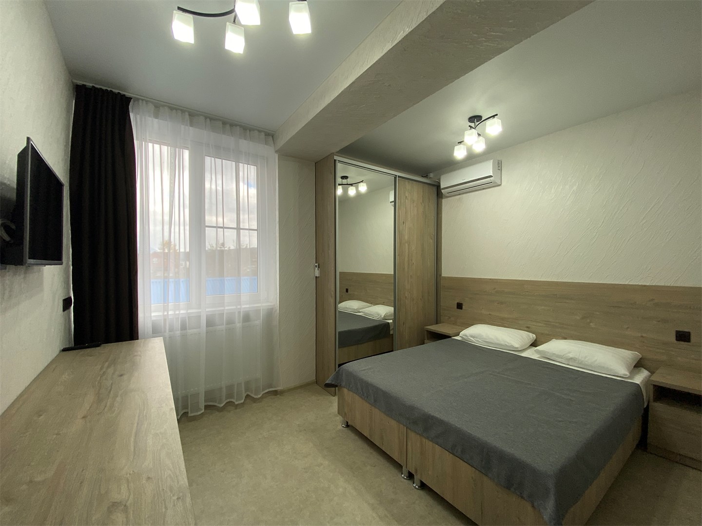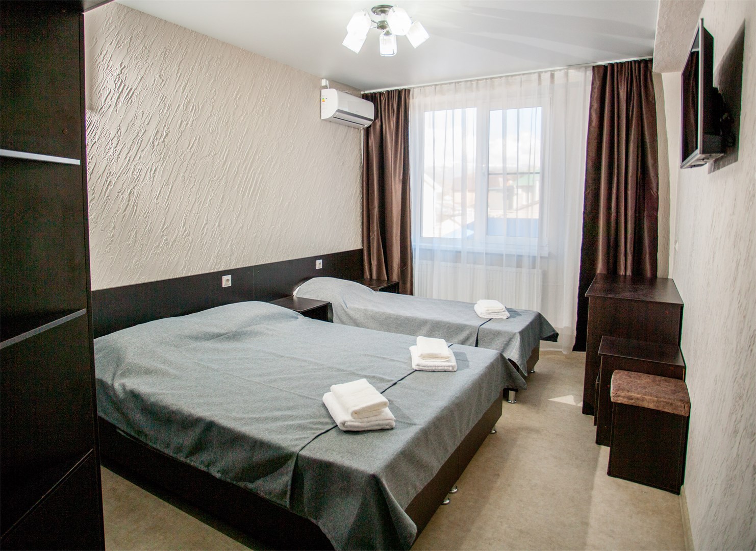 вешалка, зеркало, кровати односпальные, кровати односпальные /одна двуспальная кровать, прикроватные тумбочки, стол, стул, шкаф
