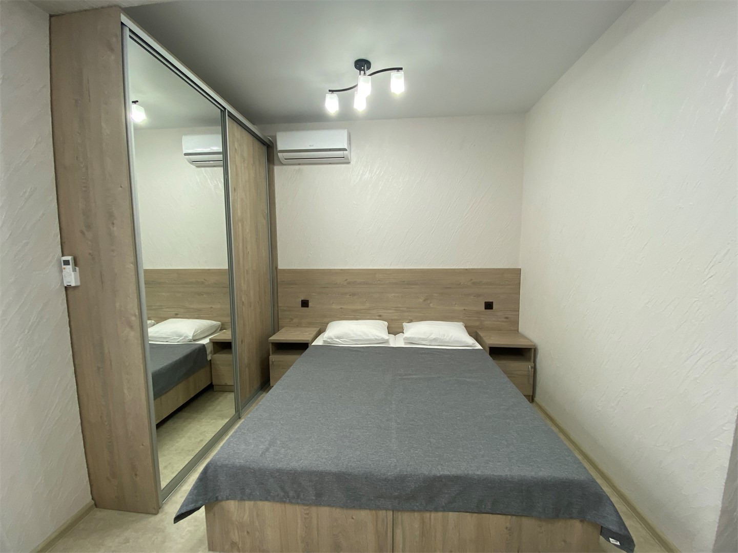 вешалка, зеркало, кровати односпальные /одна двуспальная кровать, прикроватные тумбочки, стол, стул, шкаф