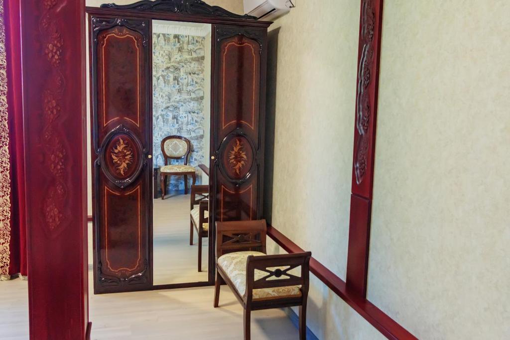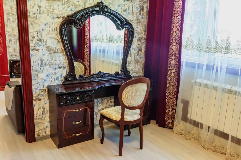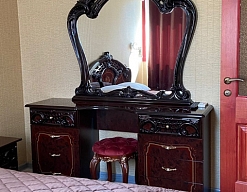 зеркало, кровать двуспальная, прикроватные тумбочки, стол, стул, шкаф