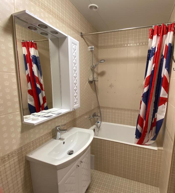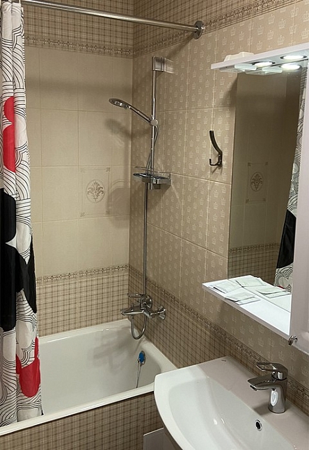 с душем, тапочки, туалетные принадлежности, фен, халат