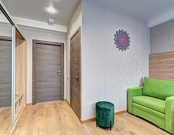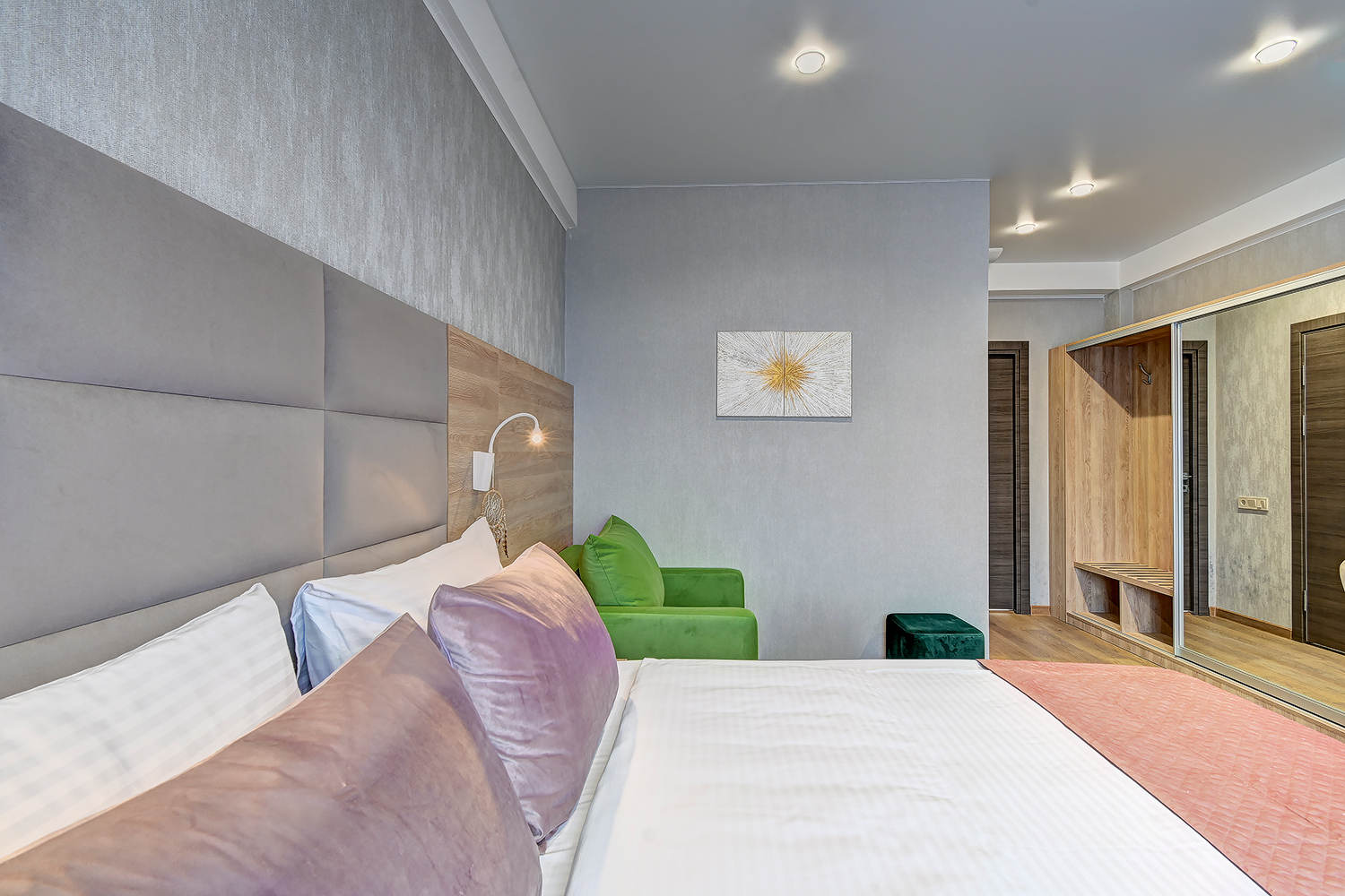 вешалка, зеркало, кресло-кровать, кровать двуспальная, прикроватные тумбочки, стол, стулья, шкаф
