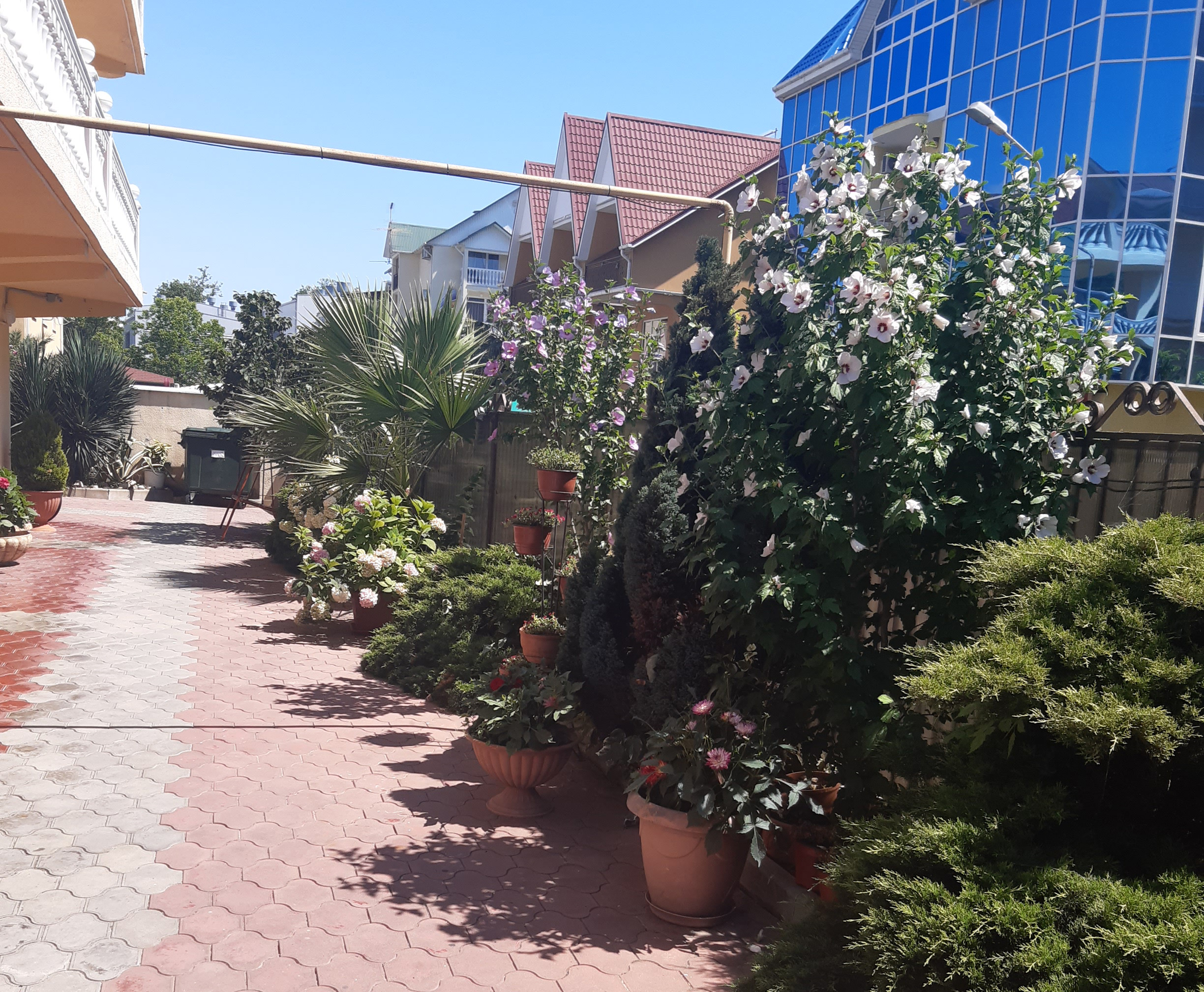 Здание гостиницы находится на некотором возвышении над пляжем, гармонично вписывается в прибрежную полосу Черного моря.