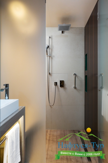 с душем, тапочки, туалетные принадлежности, фен, халат