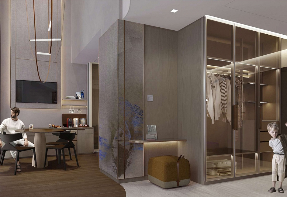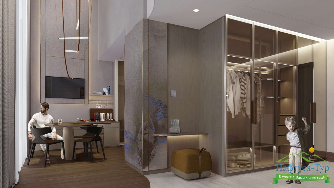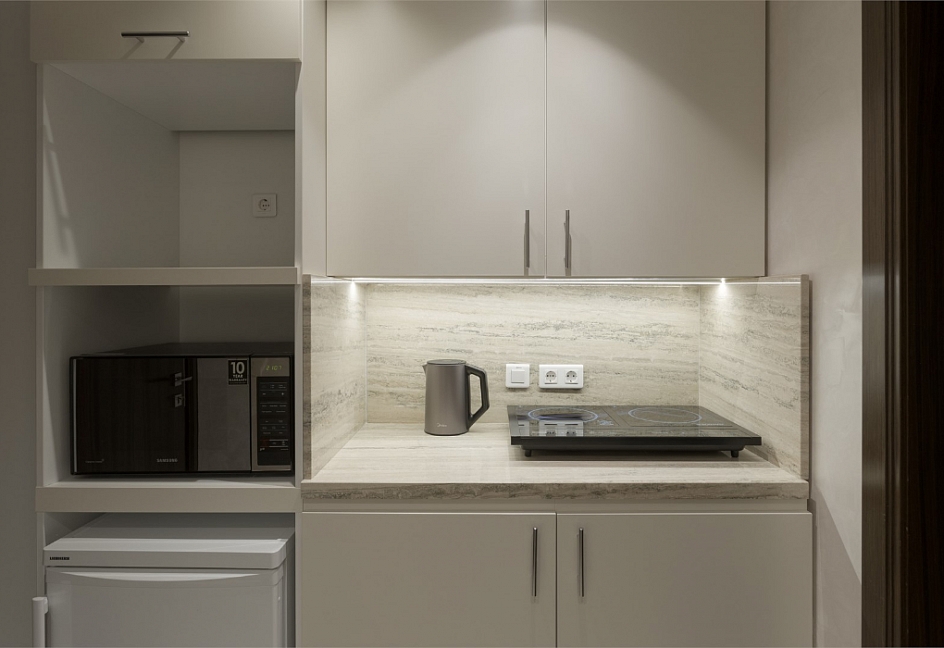 кофемашина, мини-холодильник, сейф, система общего кондиционирования, телевизор ЖК, телефон, умная колонка, утюг, чайный набор посуды, электрочайник