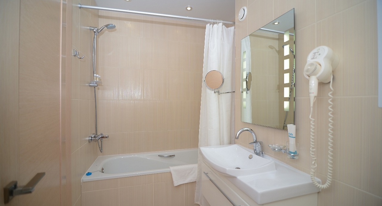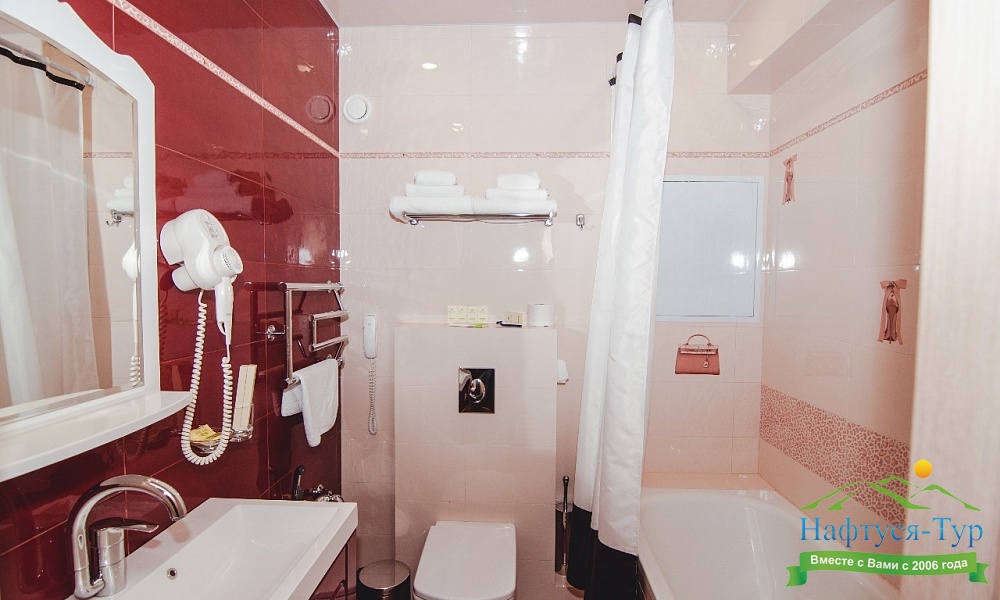 с ванной, тапочки, туалетные принадлежности, фен, халат