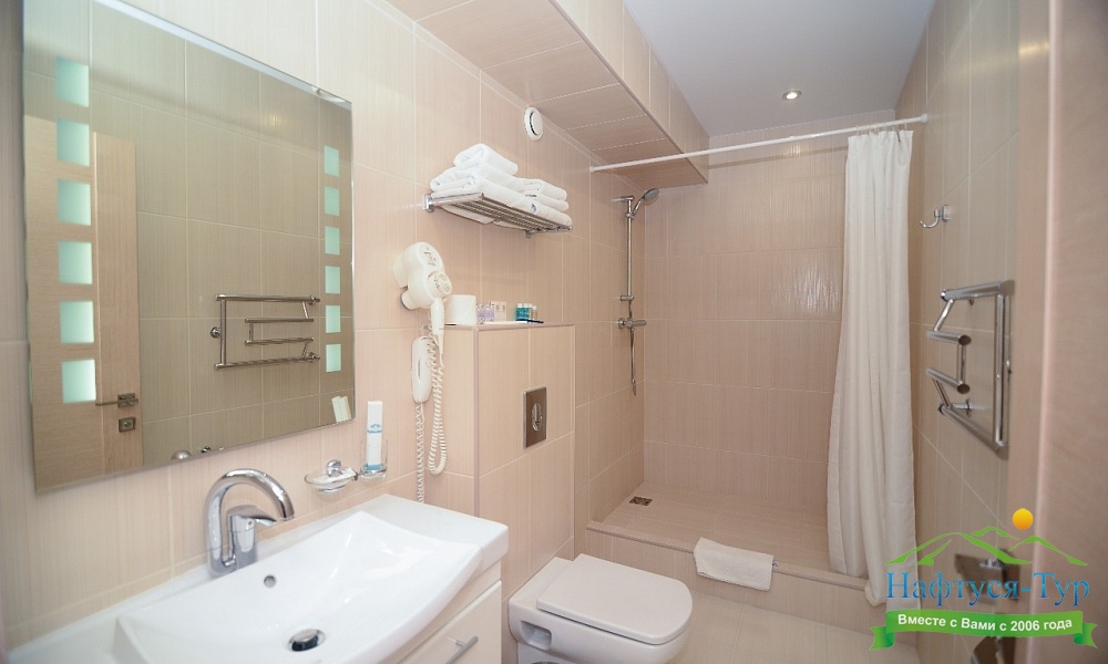 с душем, тапочки, туалетные принадлежности, фен, халат