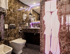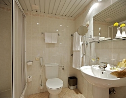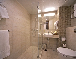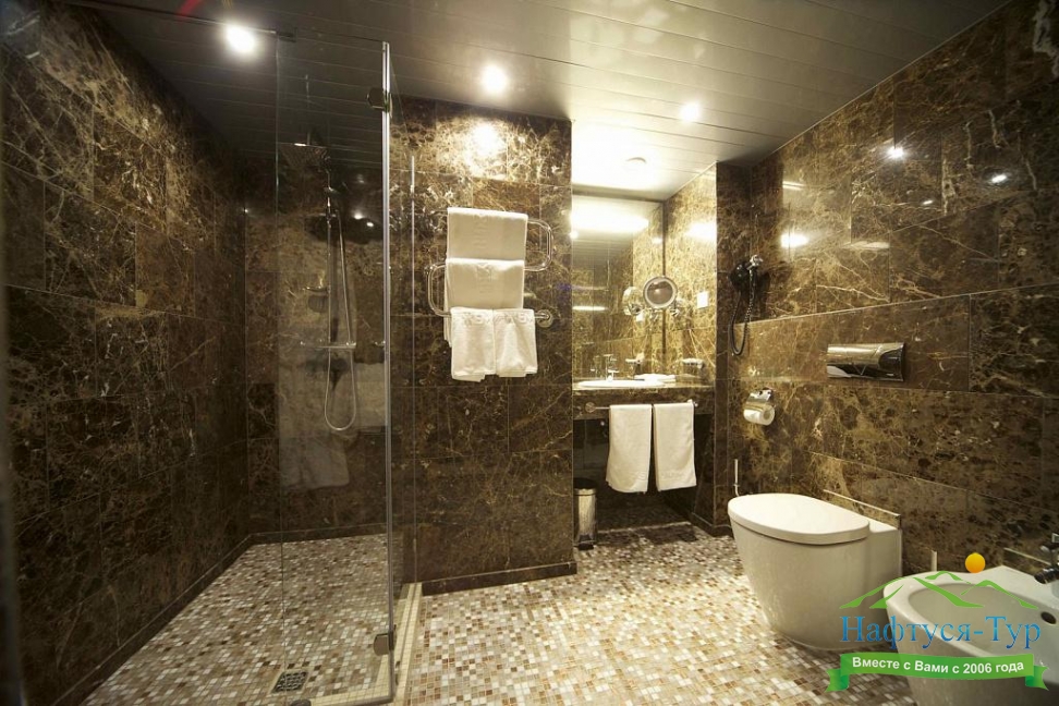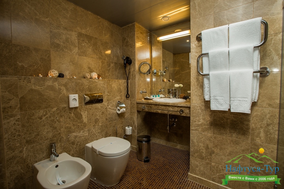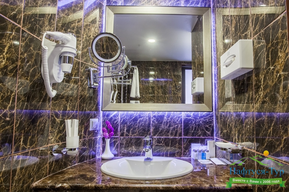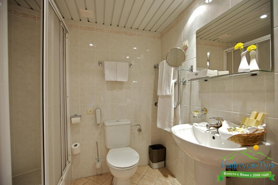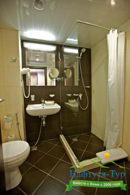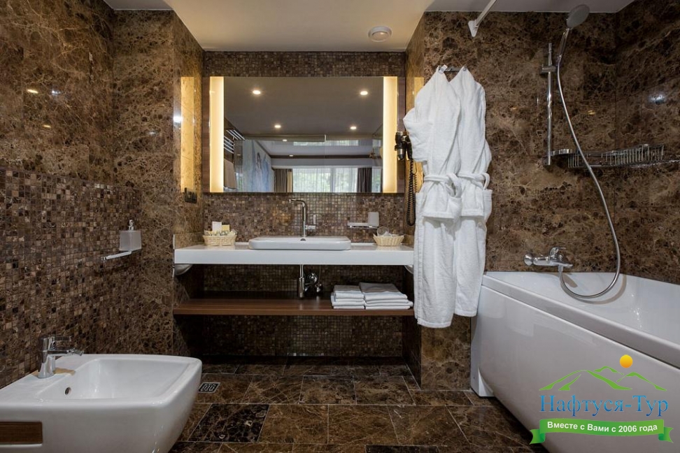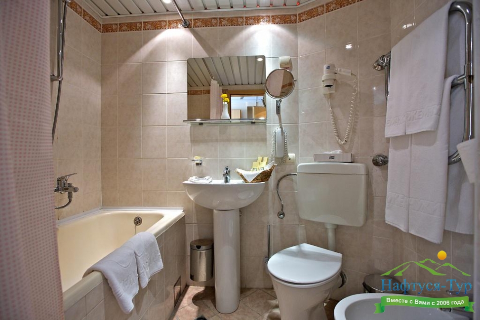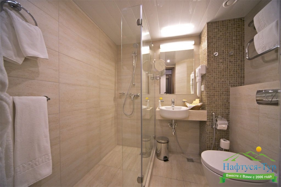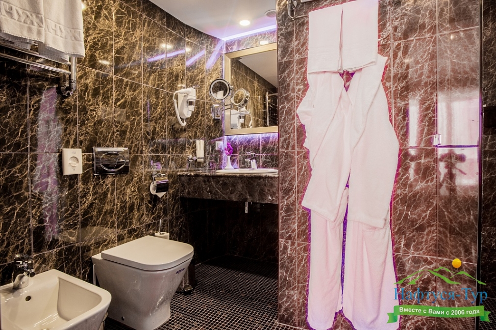 с душем, тапочки, туалетные принадлежности, фен, халат