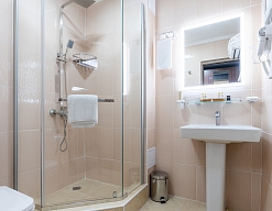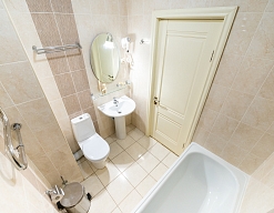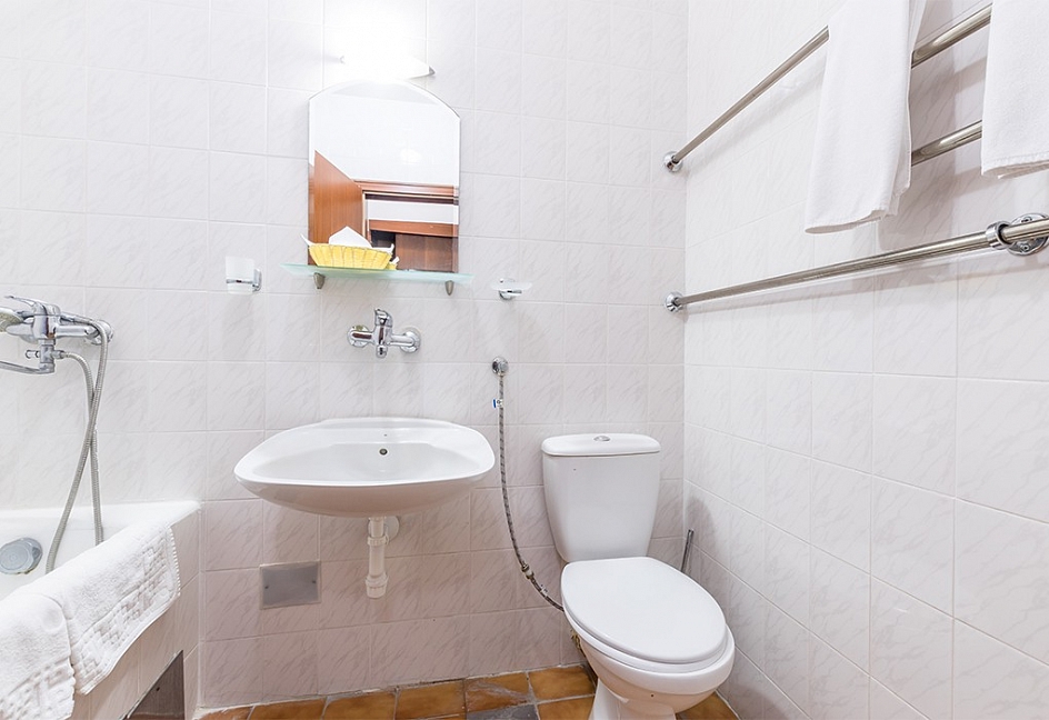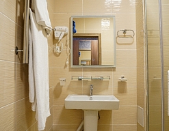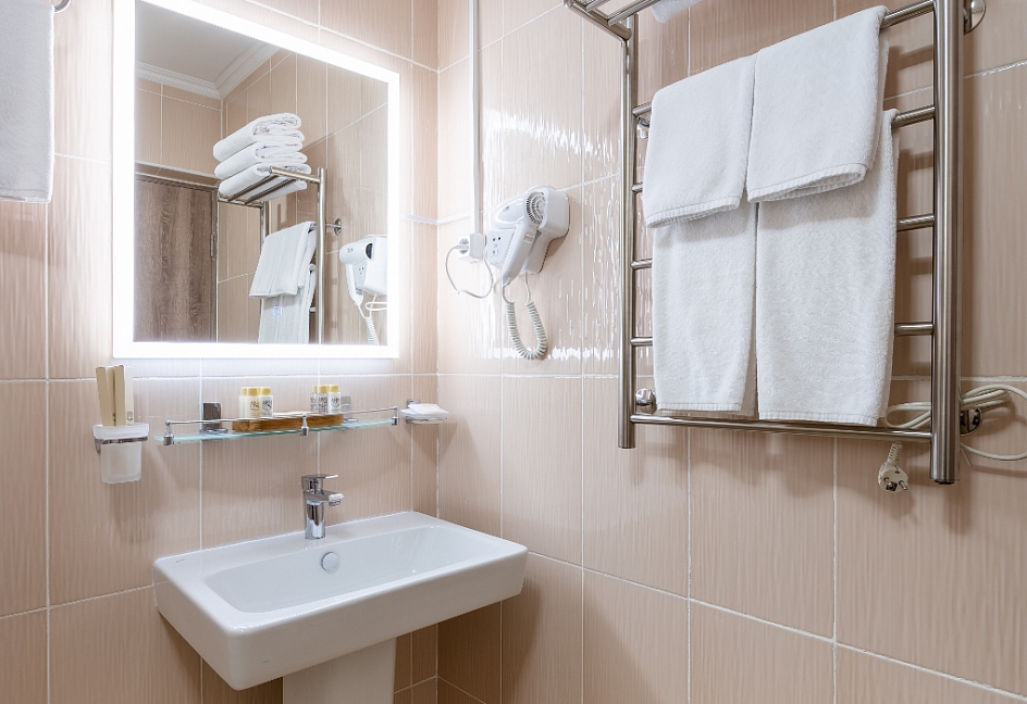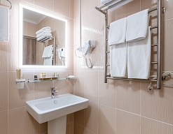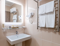 с ванной или душевой кабиной, туалетные принадлежности, фен