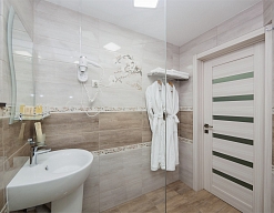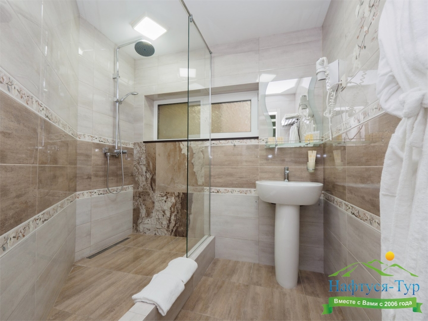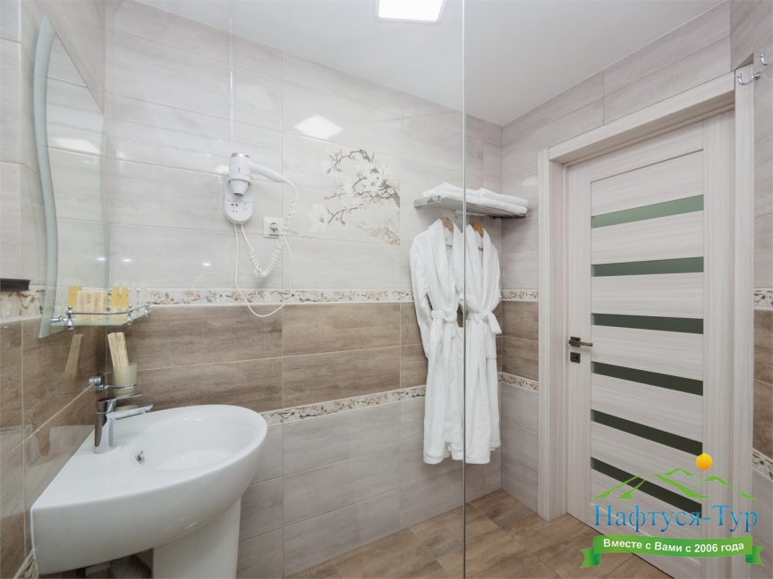 с душем, тапочки, туалетные принадлежности, фен, халат