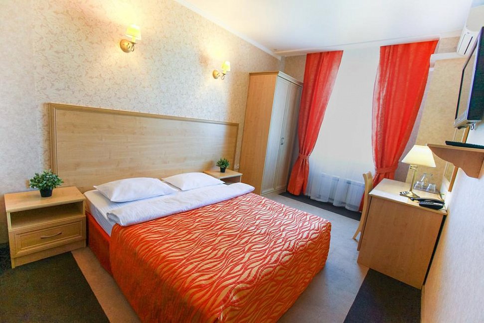 Отель разместился в здании, примыкающем к торговому центру. Гостей ожидают просторные 2-х местные номера категории Стандарт, Люкс, Полулюкс и Эконом без окна. Номера с классическим интерьером оборудованы собственной ванной комнатой с душем, необходимой бытовой техникой и укомплектованы спальным гарнитуром и мягкой мебелью.