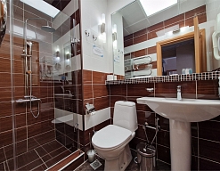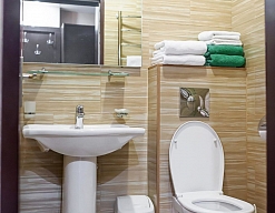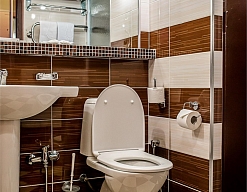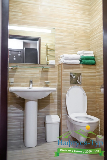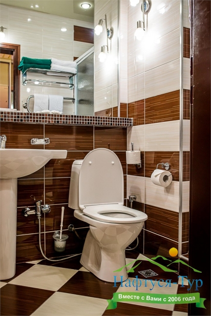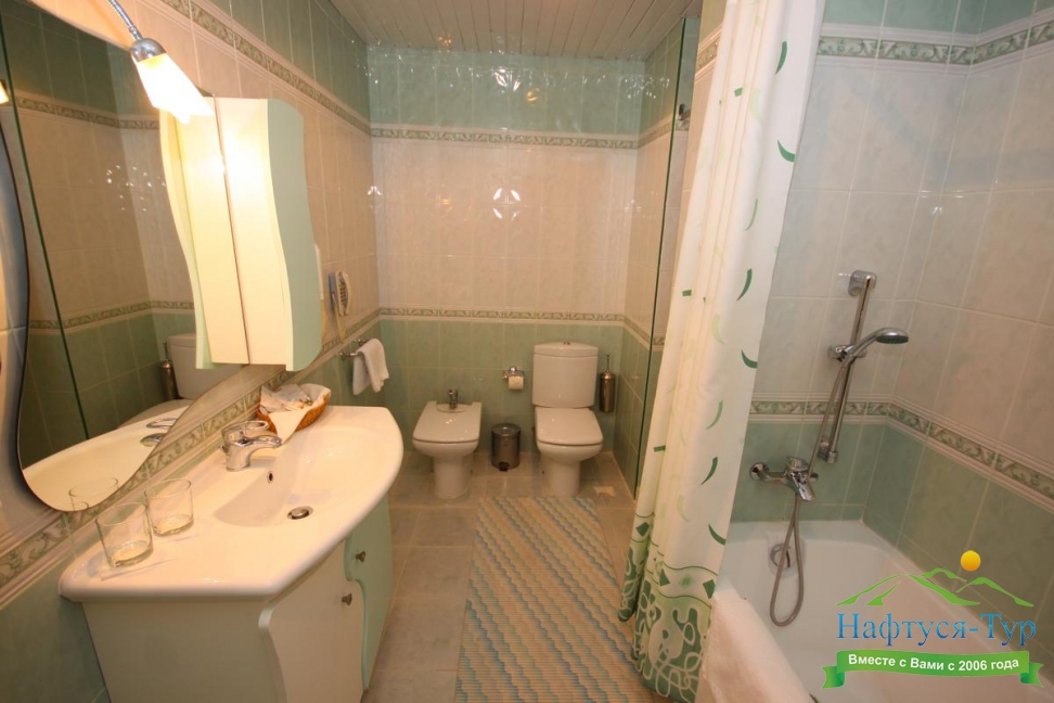 биде, с ванной и душевой кабиной, тапочки, туалетные принадлежности, фен, халат