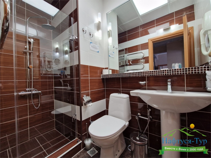с душевой кабиной, тапочки, туалетные принадлежности, фен, халат